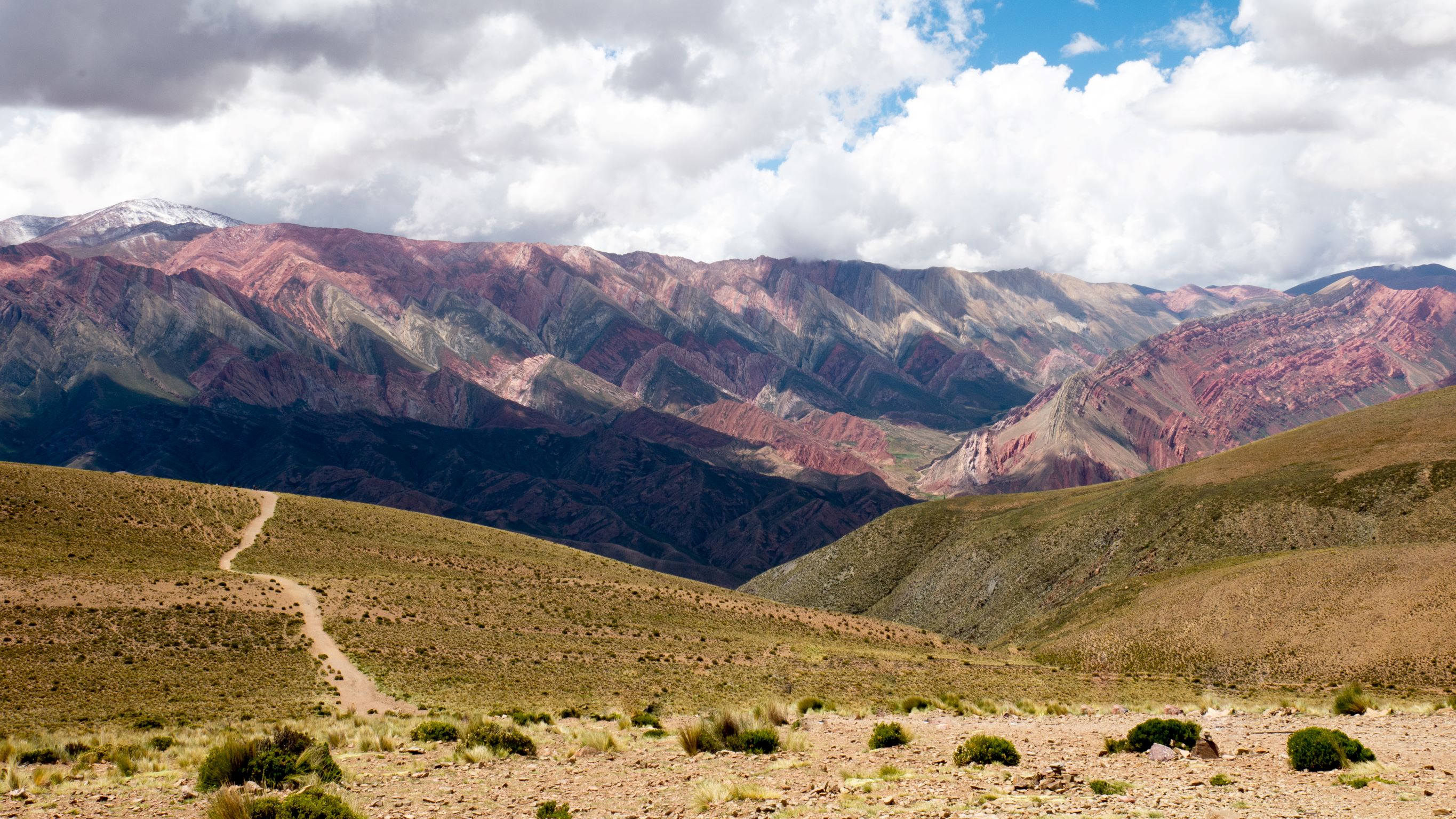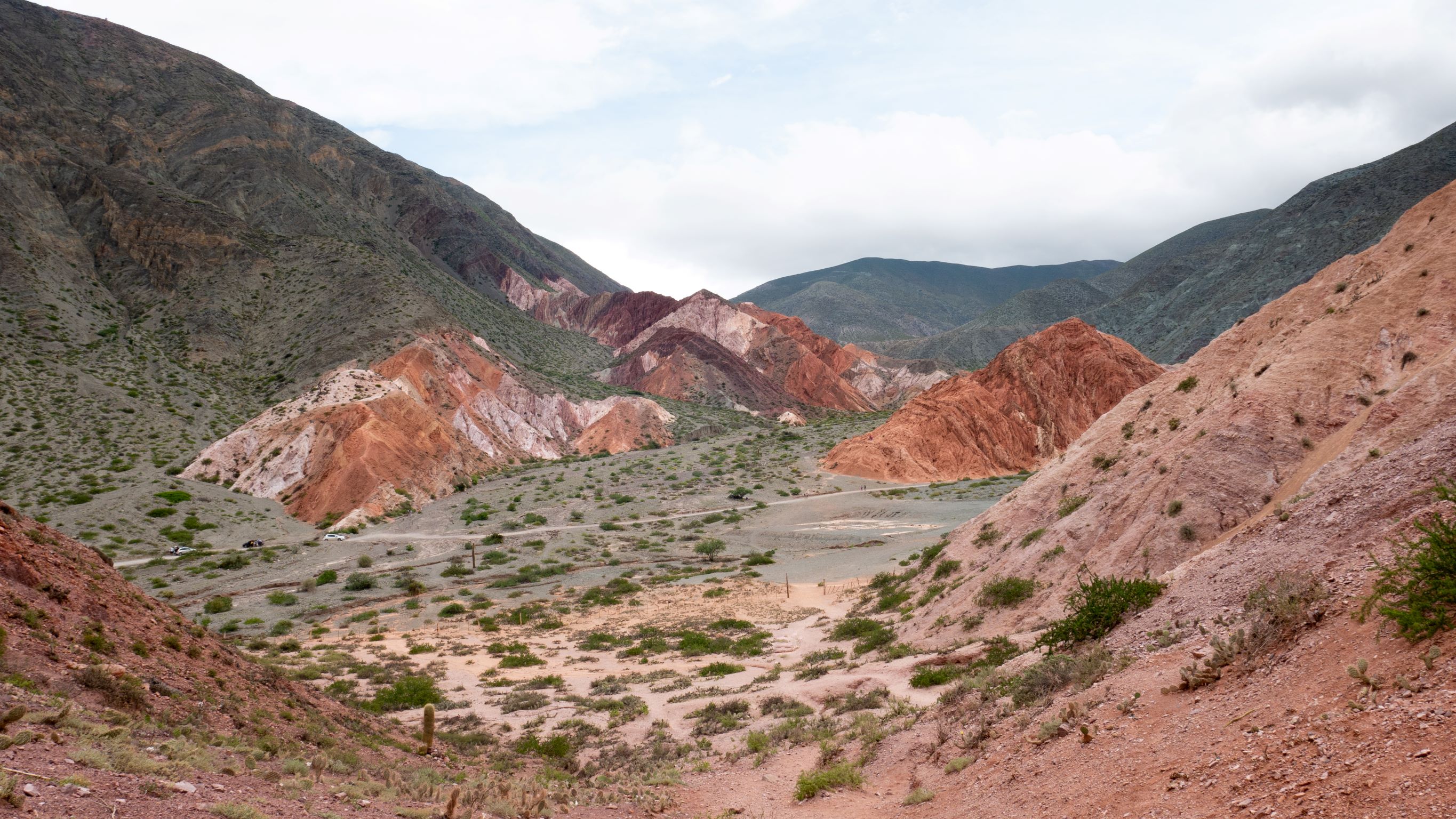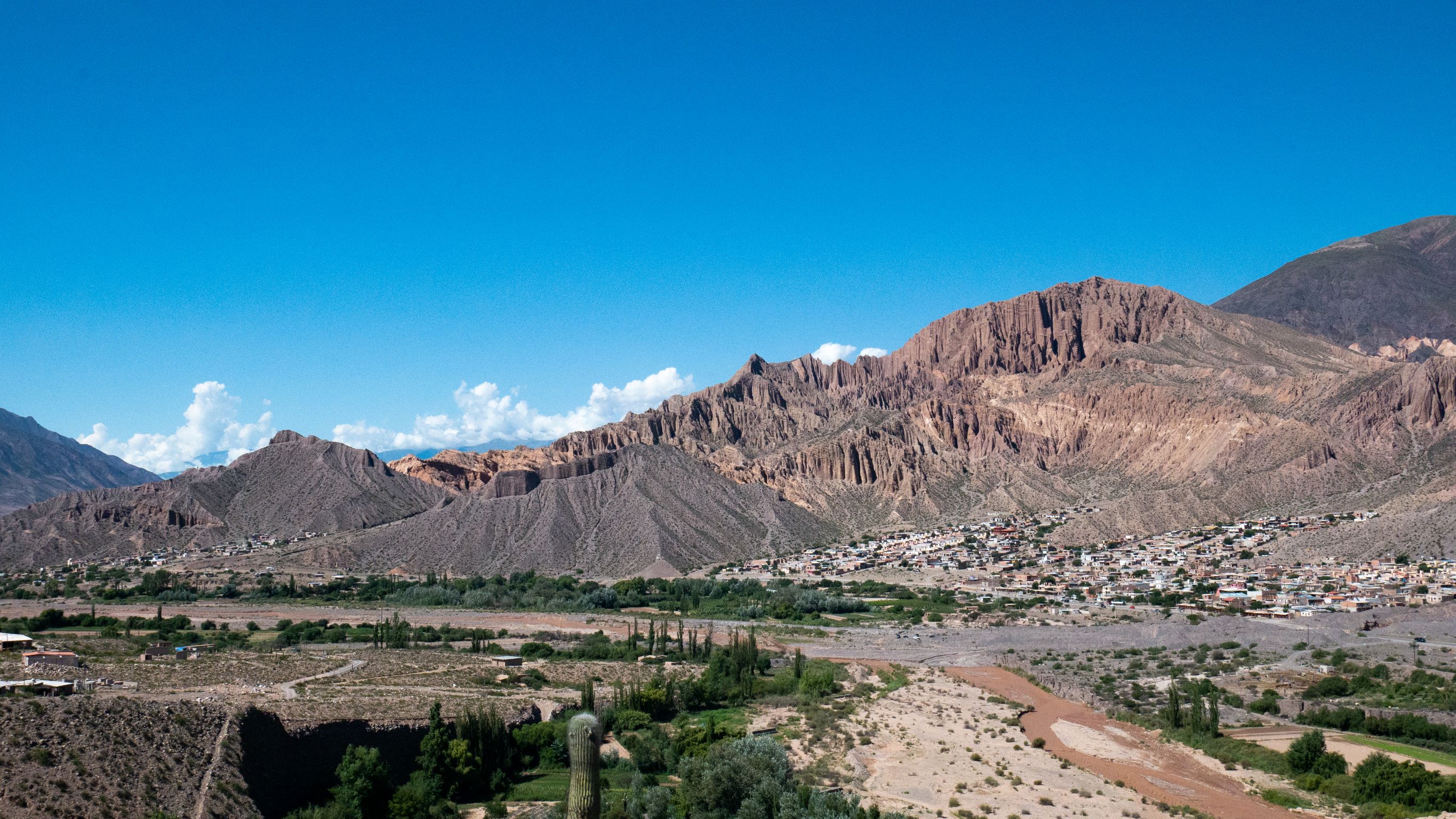 Arrivés à Humahuaca (3000m d’altitude) on découvre un petit village typique, hyper croyant avec procession dans la ville, chants religieux diffusés par les hauts parleurs de l’église du village (notre réveil, d’ailleurs, pendant 4 jours). D’ici, nous quittons à nouveau le goudron pour prendre une piste en direction du fameux « Hornocal » (montagne aux 14 couleurs) à 4350 m d’altitude. On ne vous cache pas qu’à cette altitude on ne galope pas.. C’est plutôt le souffle court et à la vitesse escargot qu’on découvre ce paysage magnifique.
