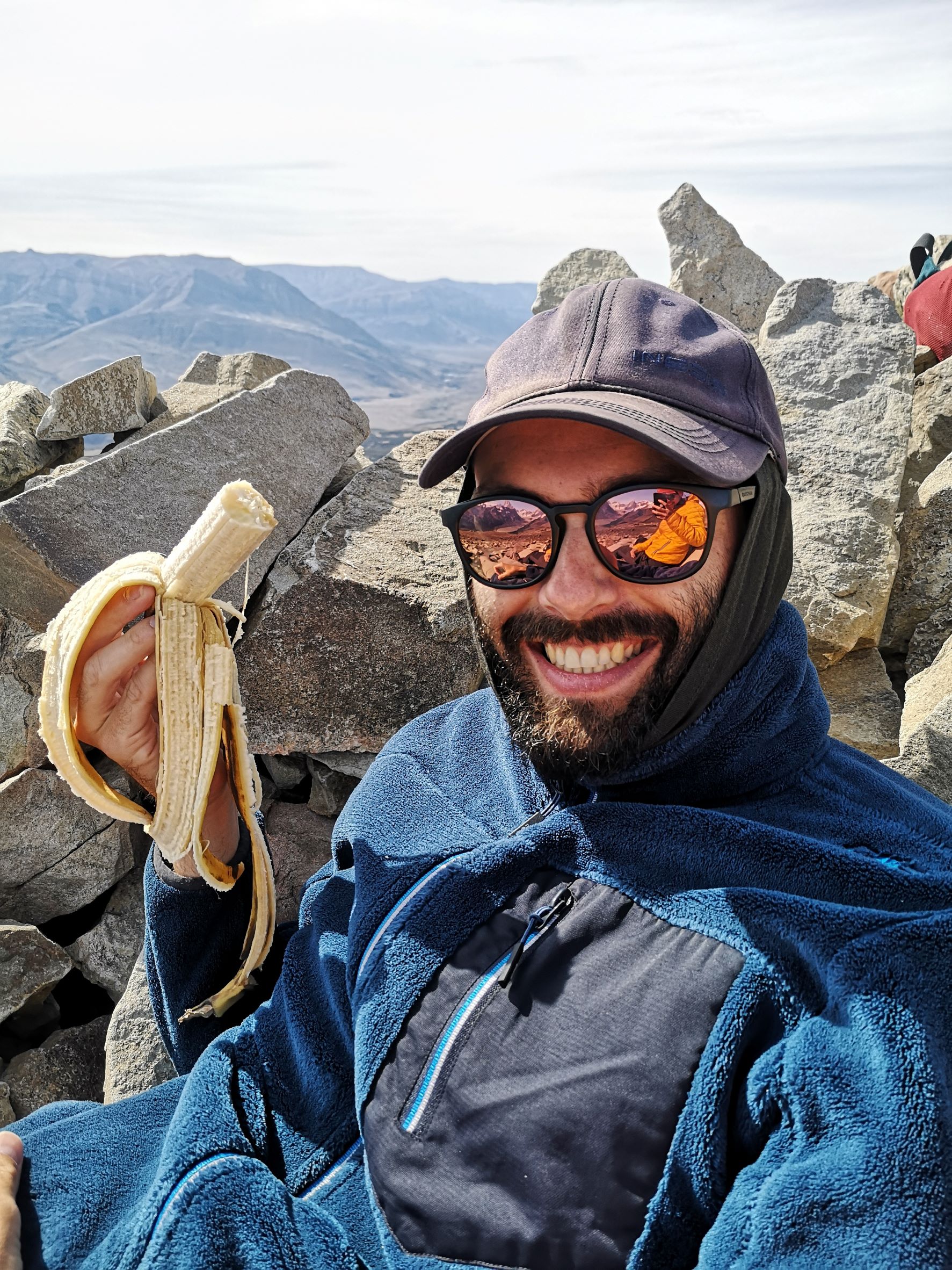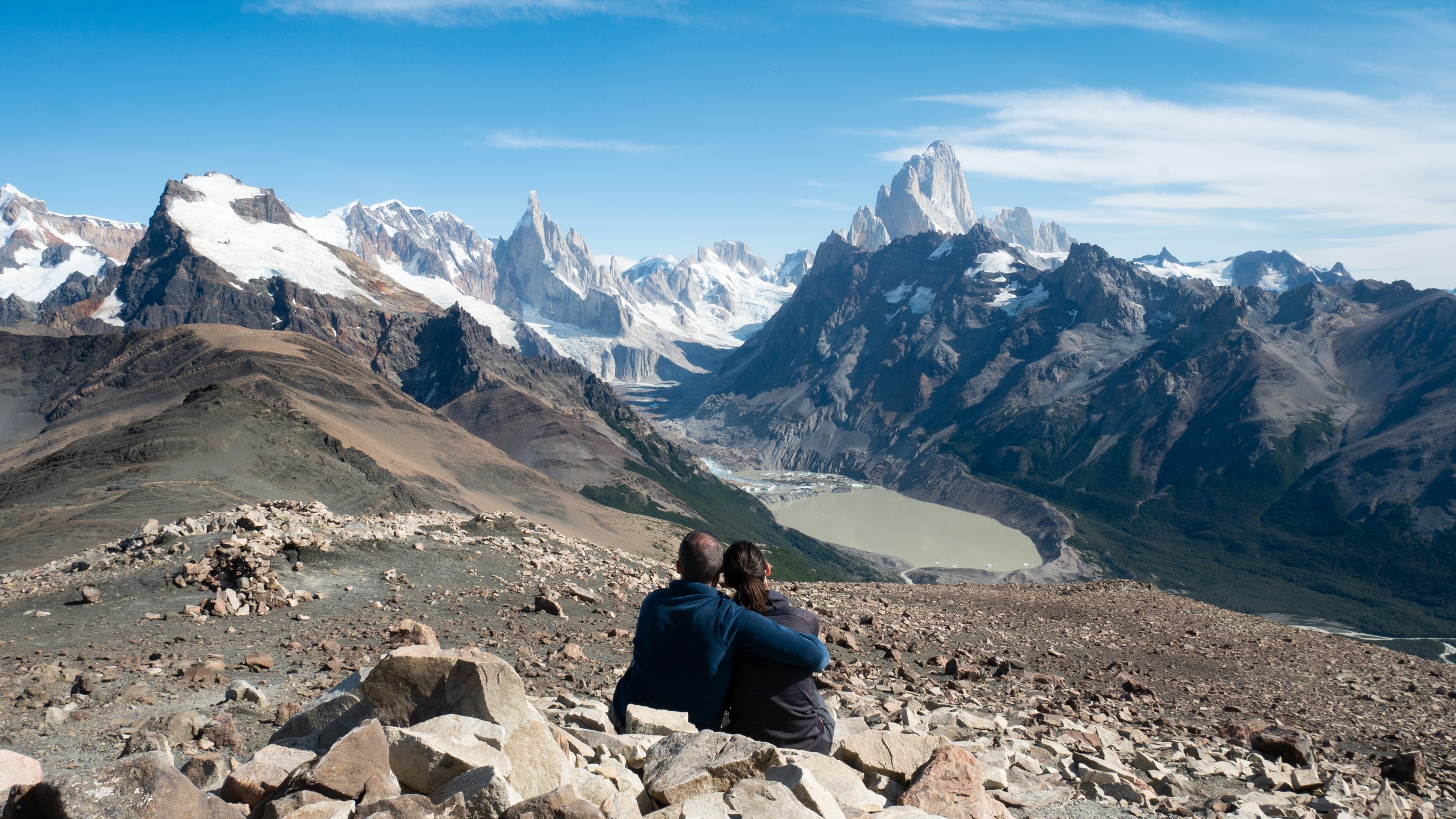 En haut, bouche bée, nous sommes seuls face à ce paysage grandiose, une vue à 360°. On ne sait pas où regarder…La pampa ? Le Lago Argentino, d’un bleu laiteux incroyable ? Les pics enneigés du Chili ? Le Cerro Torre, qui se reflète dans sa Laguna ou bien l’imperturbable Fitz Roy ?