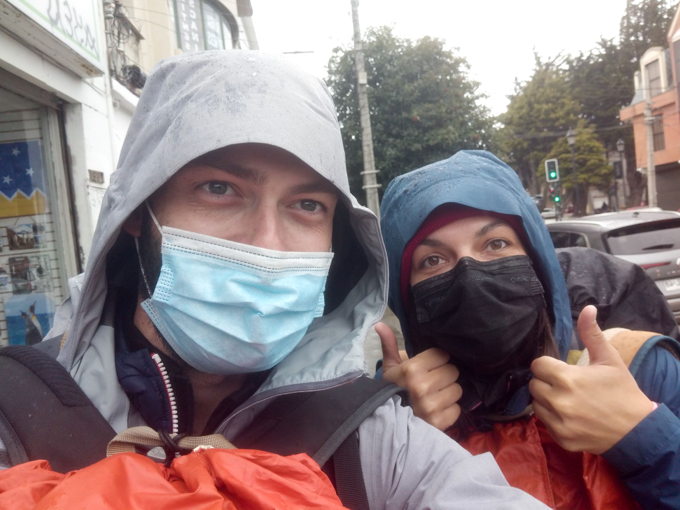 Le taxi nous dépose à Punta Arenas. Nos premiers pas au Chili se font sous la pluie et sont consacrés à trouver une carte SIM chilienne, retirer de l’argent, acheter un billet de bus et manger. Autre différence, ici, on nous demande le « Pass Movilidad » pour rentrer au restaurant.