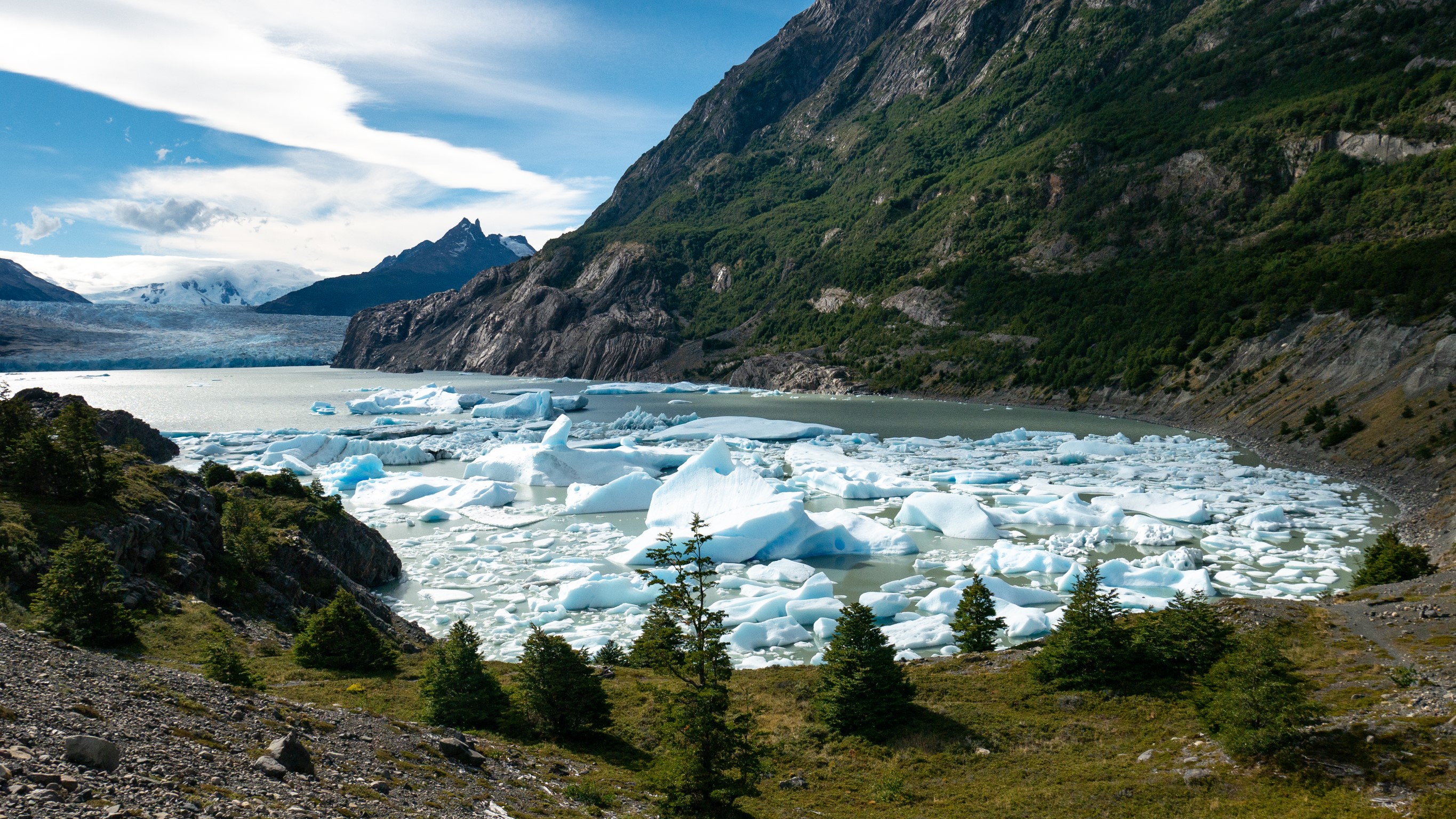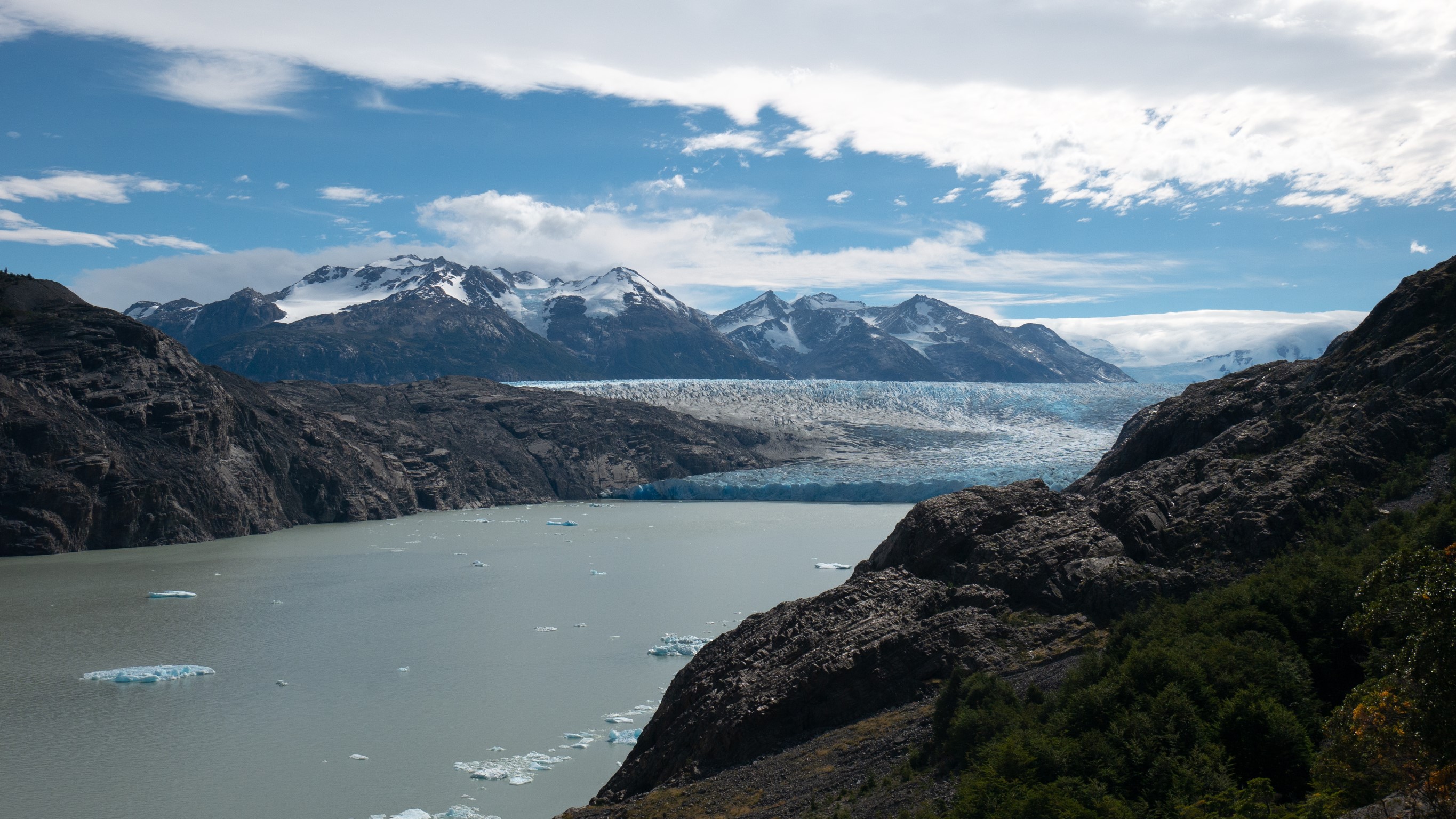 4h plus tard notre récompense est là, le « Mirador du glacier Grey ». Le glacier est immense, d’un bleu comme nous n’en avions encore jamais vu et surtout ses énormes icebergs qui flottent non loin de lui sur le « Lago Grey ». Ils sont si proches de nous que nous pourrions les toucher. Ils grondent, ils craquent, quelques bouts s’en détachent et tombent dans l’eau avec fracas. Une fois de plus nous sommes émerveillés devant ce spectacle mais pas le temps de s’attarder, il faut déjà rentrer puisque les douches ferment à 21h30 au camping.