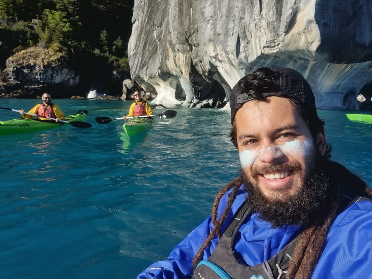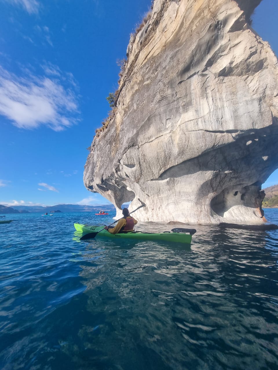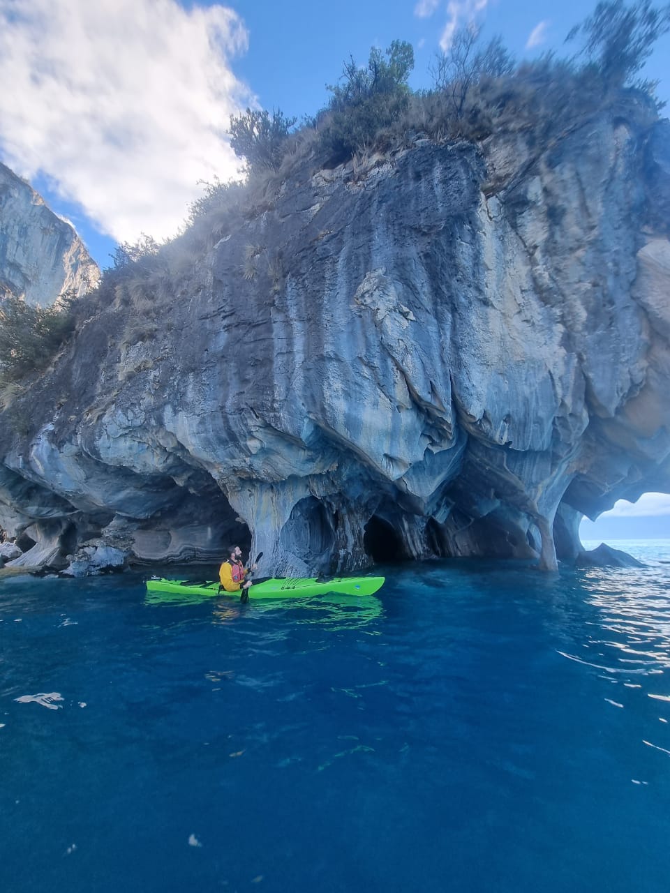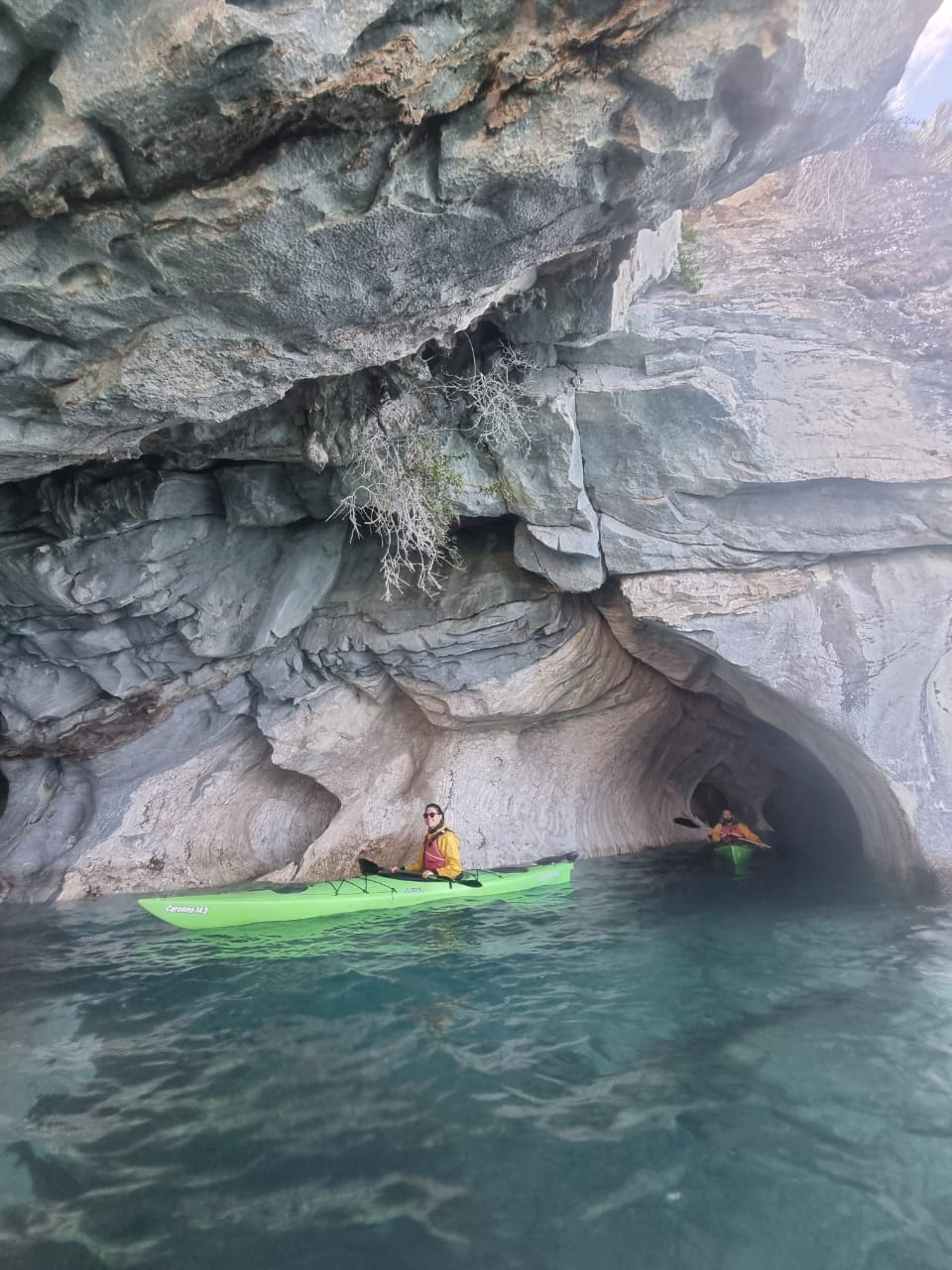 On rentrera au petit matin, à peine le temps de fermer un œil qu’il faut déjà ouvrir l’autre pour prendre le seul bus (où il ne restait que 2 places) direction Puerto Rio Tranquilo. Ce petit village au bord du lac est mignon. C’est très réputé pour ses falaises de marbre de la Capilla de Marmol. On décide alors, de faire l’excursion en Kayak pour aller les découvrir. (1h30 -> 45€/pers). Par chance nous sommes que 3 à faire le tour et le beau temps est de la partie.