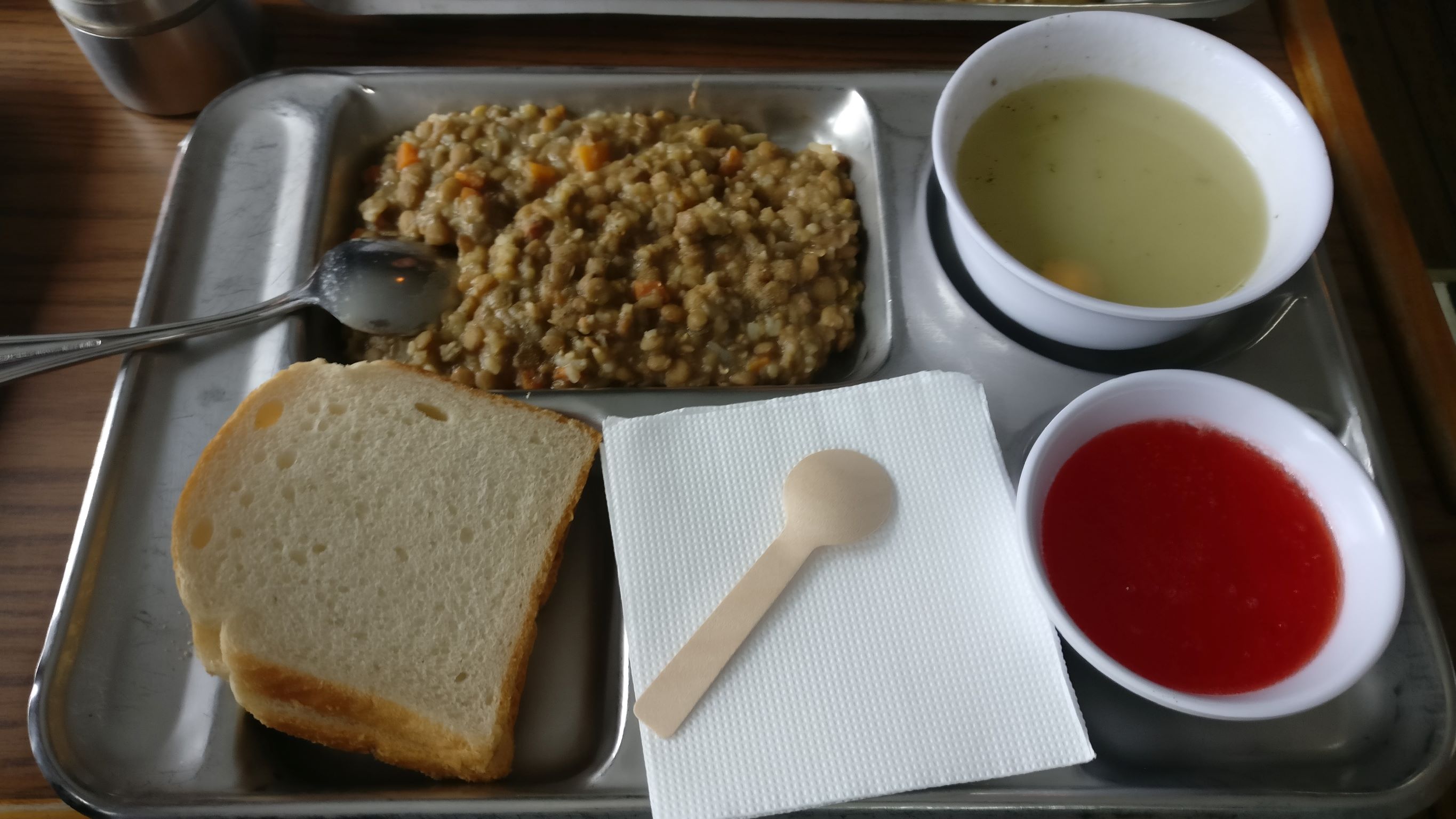 Ils ont découpé les 140 passagers en groupes de 30 pour aller manger à tour de rôle. On nous appelle aux haut parleurs « Goupe 1- réfectoire ! », avons 15 min et pas une de plus pour manger avant d’être dégagés comme des malpropres. Oui, même si tu as encore la bouche pleine, même si tu as mis 10 min à obtenir ta maigre portion, même si tu en es qu’au milieu de ton plat…tu dégages !!