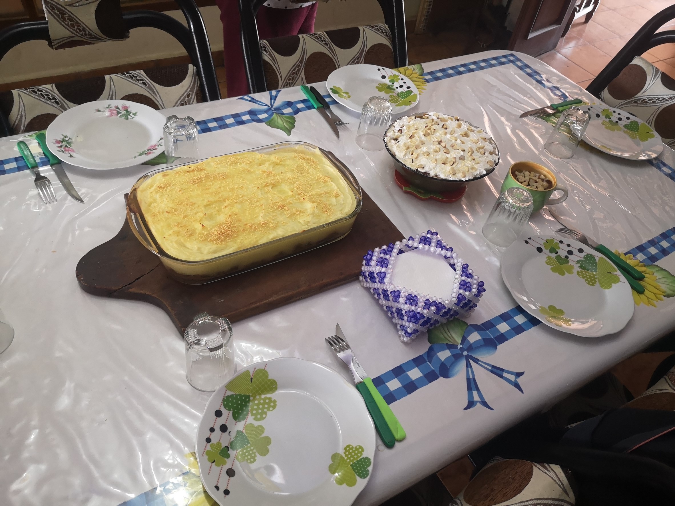 Magui et Edmundo, amis depuis l’enfance avec Carmen sont alors conviés dans sa maison pour y partager un repas avec toute la famille. Etant leurs « enfants » pour la semaine, nous venons avec eux. Ici la tradition veut que l’on serve, aux invités un « api » boisson tiède à base de maïs violet, cannelle et clou de girofle (très fort !!). C’est épais et pas vraiment à notre goût mais ne pouvons pas refuser. La famille nous distribue également des bugnes boliviennes (spécialité technique à réaliser) qui était le plat préféré de la défunte.