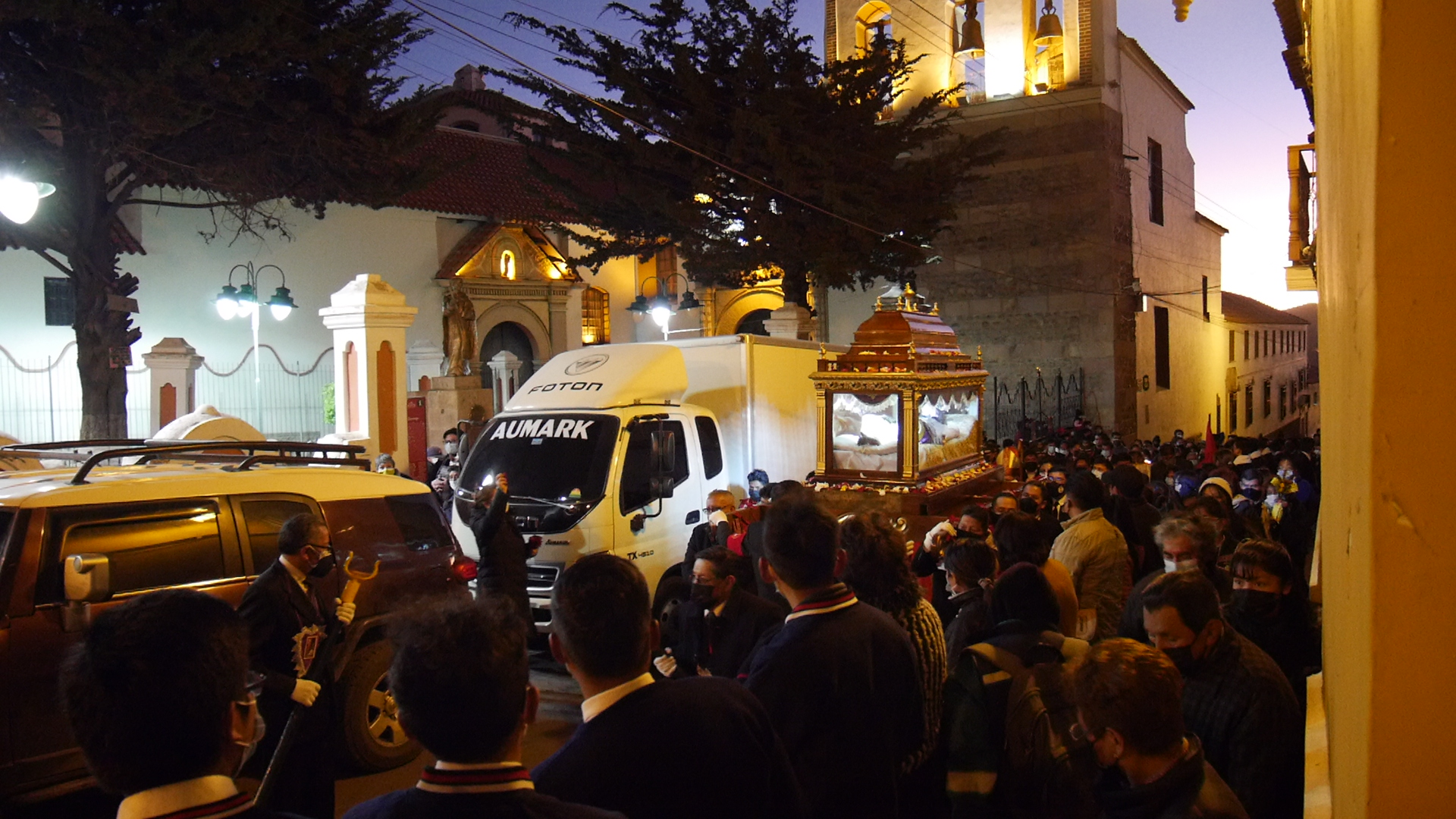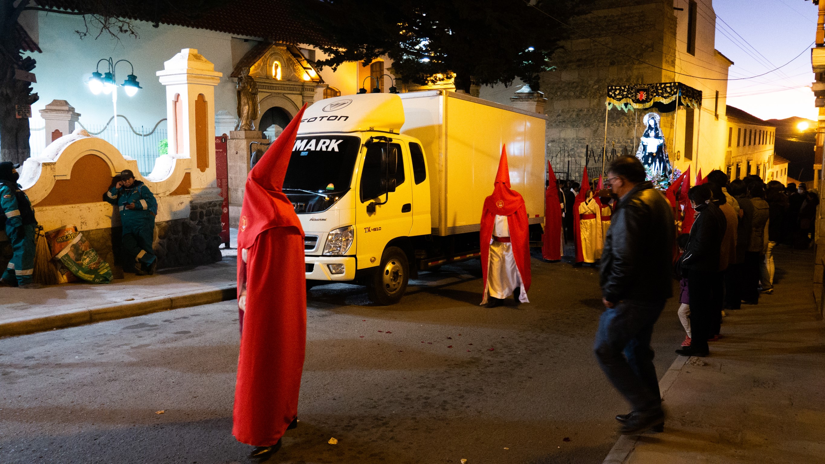 Le soir, nous assistons aux processions, qui occupent absolument toutes les rues du centre, avec tenues spéciales, bougies, calottes rouges (ça c’est déroutant on se croirait à une soirée du Ku klux Klan mais colorée), cercueil avec statue de Jésus et une immense représentation de la vierge où les passants jettent des pétales.