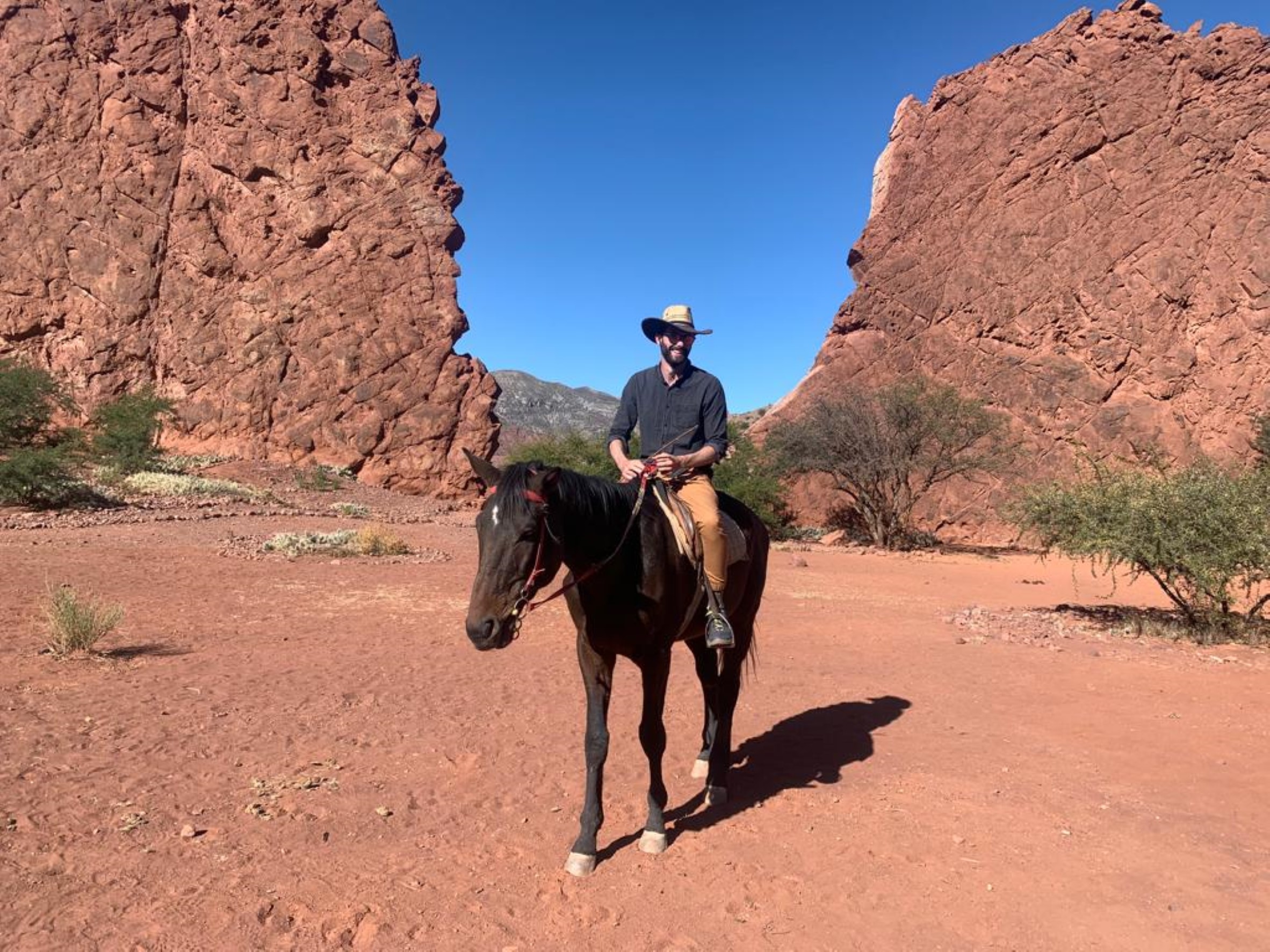 Arrivés à la « Puerta Del Diablo », nous descendons de nos montures prendre quelques photos et « oh, au loin on entend quelques énervements ». Django et Chuflay se grognent après…comme par hasard !! Puis finissent par se mettre des grandes ruades, réussissent à se détacher et voilà mon Chuflay qui s’enfui loin, très loin, trop loin ?….Bon bah je n’ai plus de cheval, super ça !