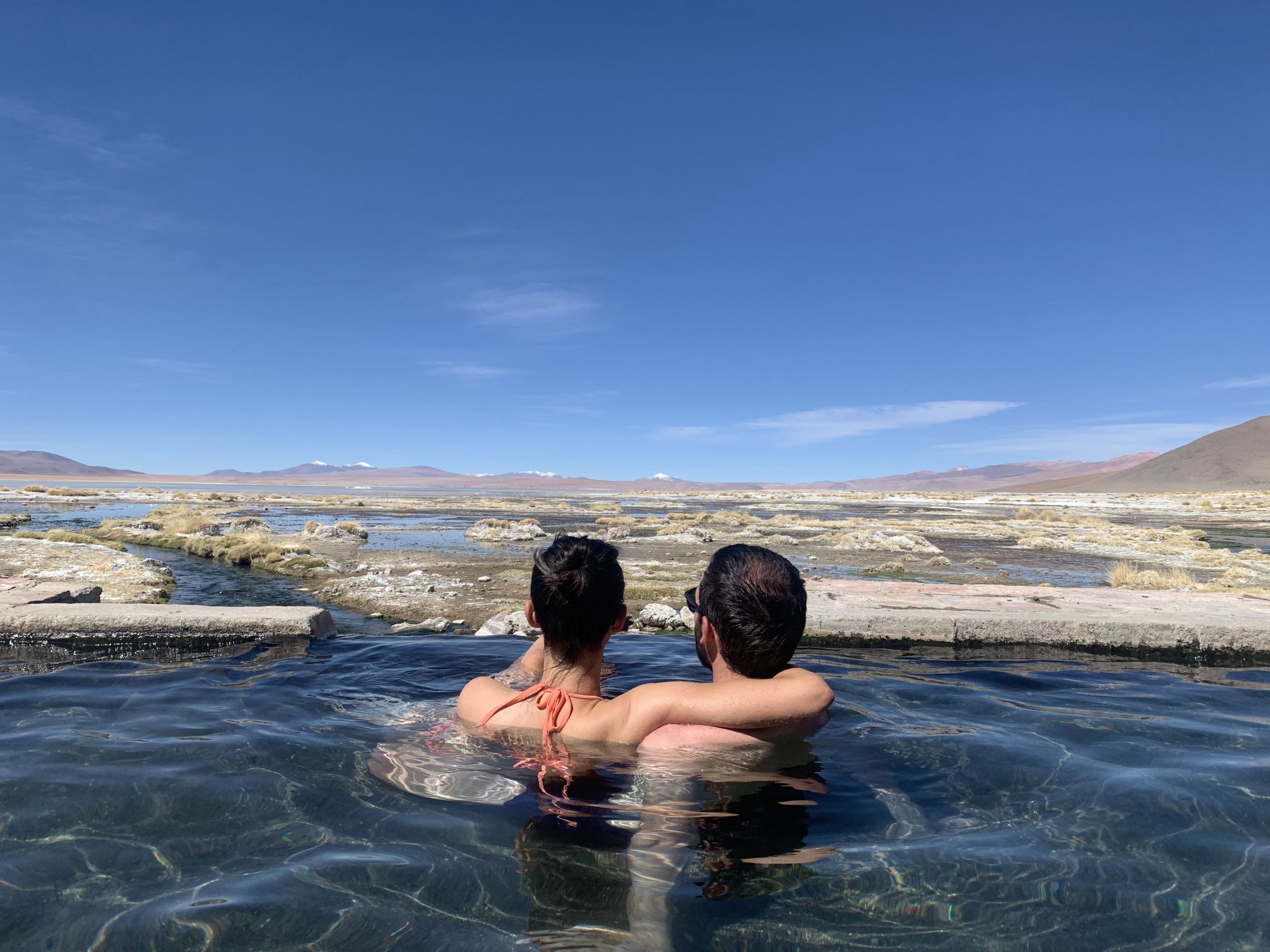Pour nous remettre de nos émotions, nous allons faire trempette dans des eaux thermales, les 38° sont bienvenus à cette altitude et la vue, devinez quoi ? Est incroyable 😊 !