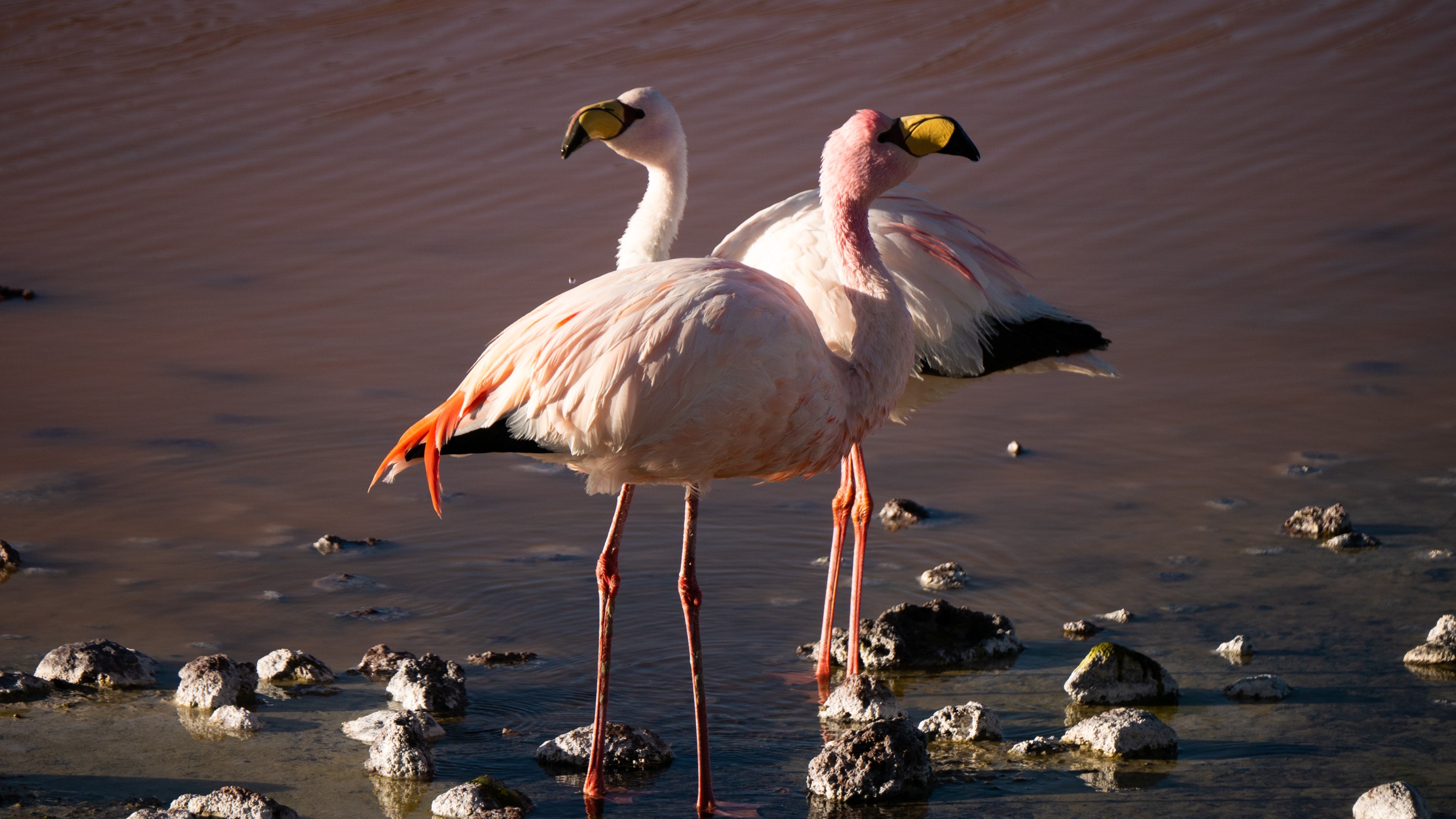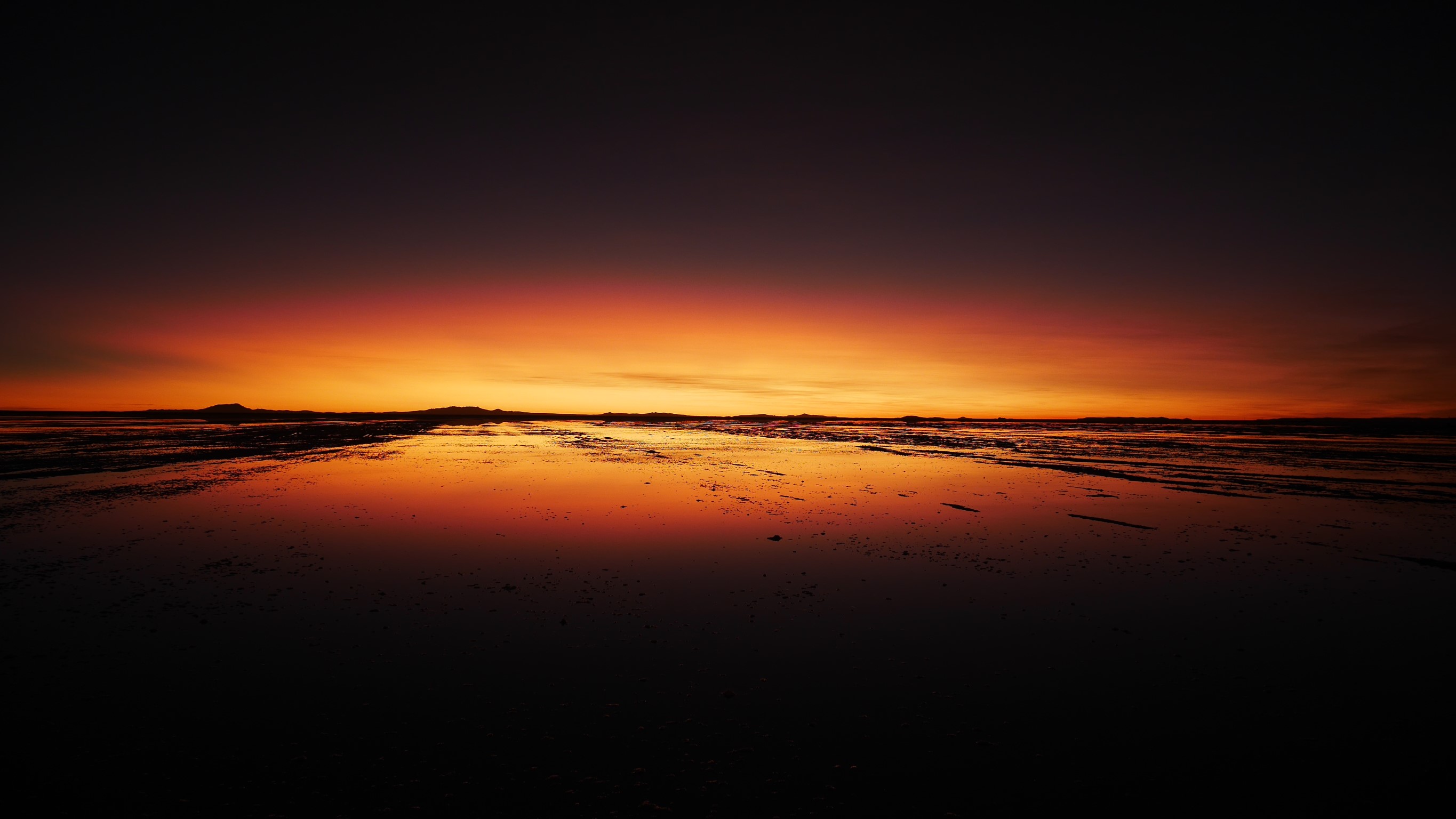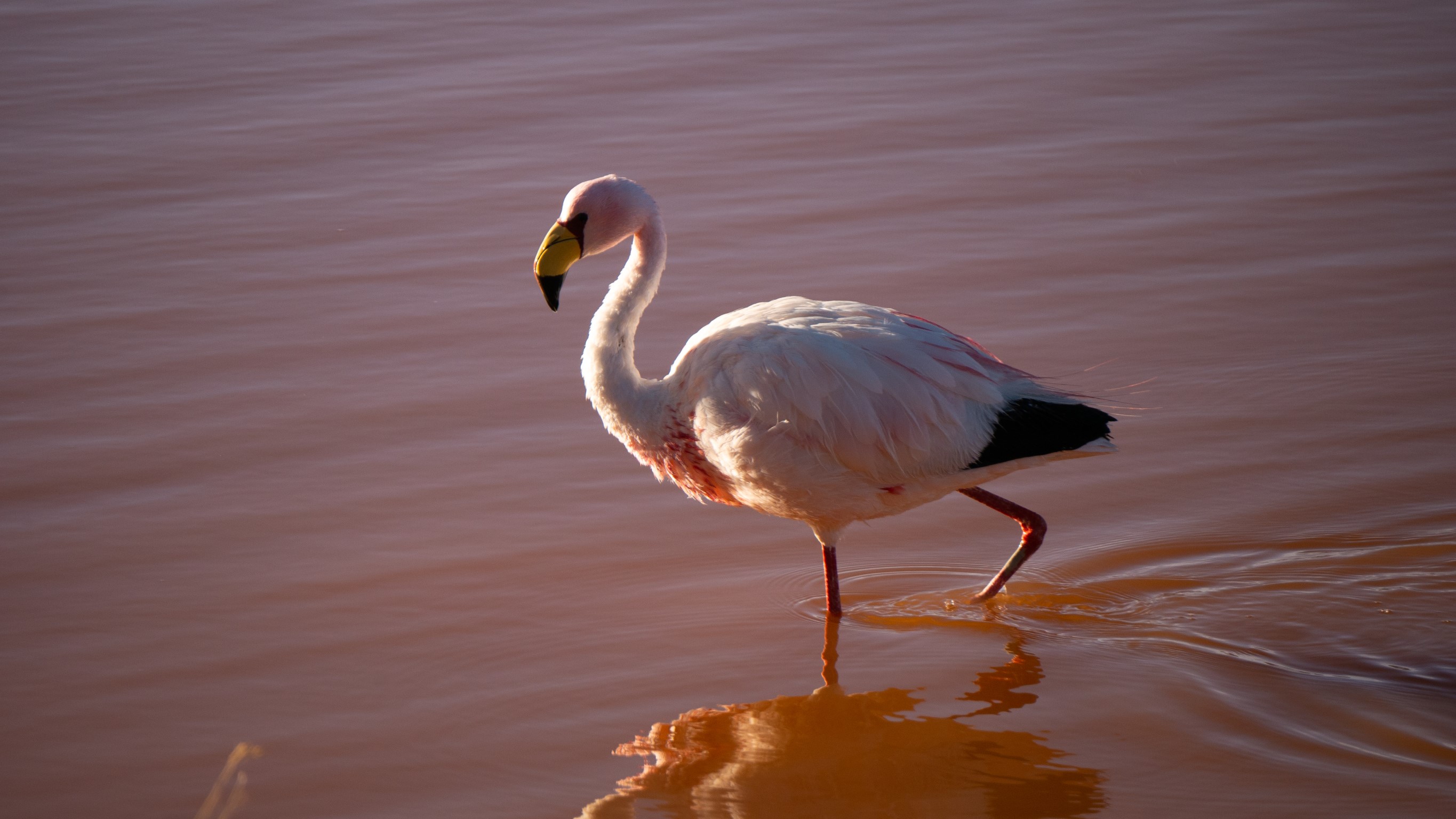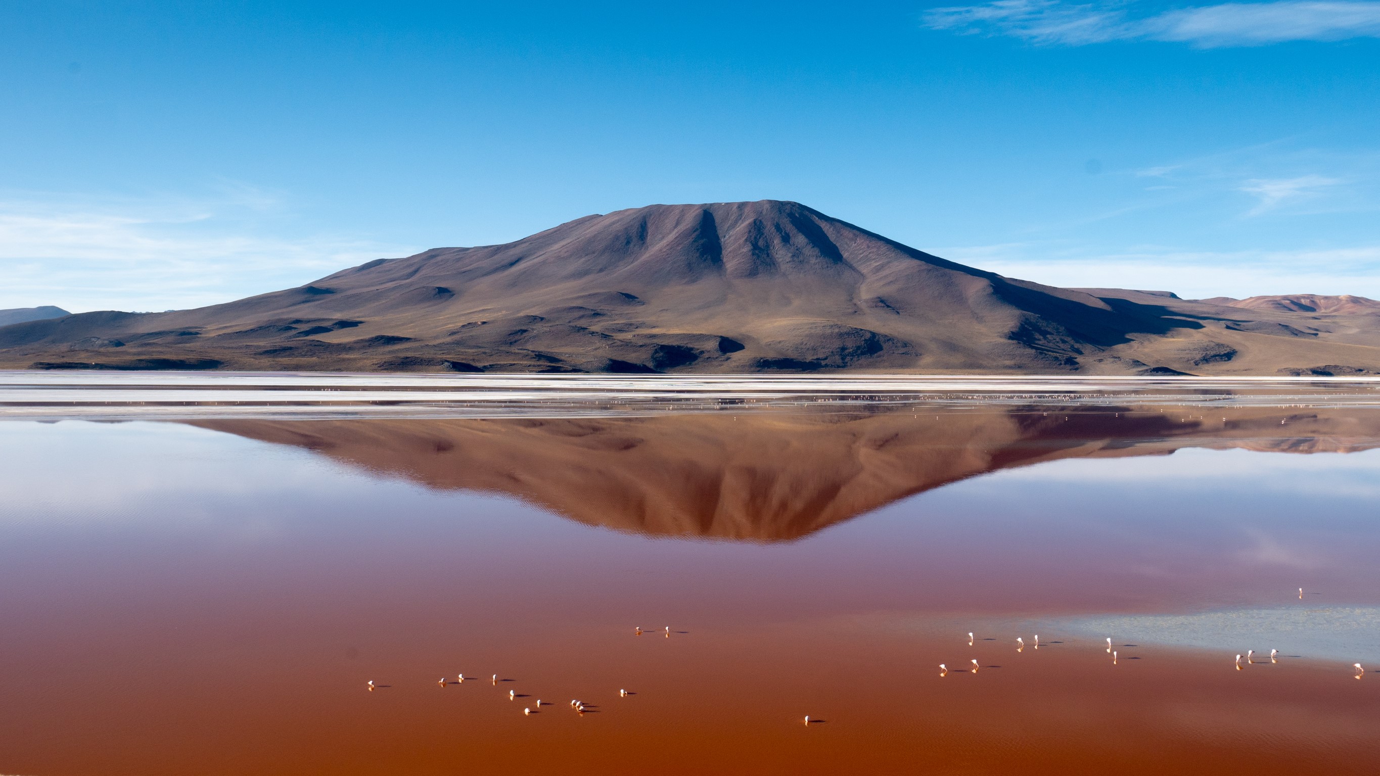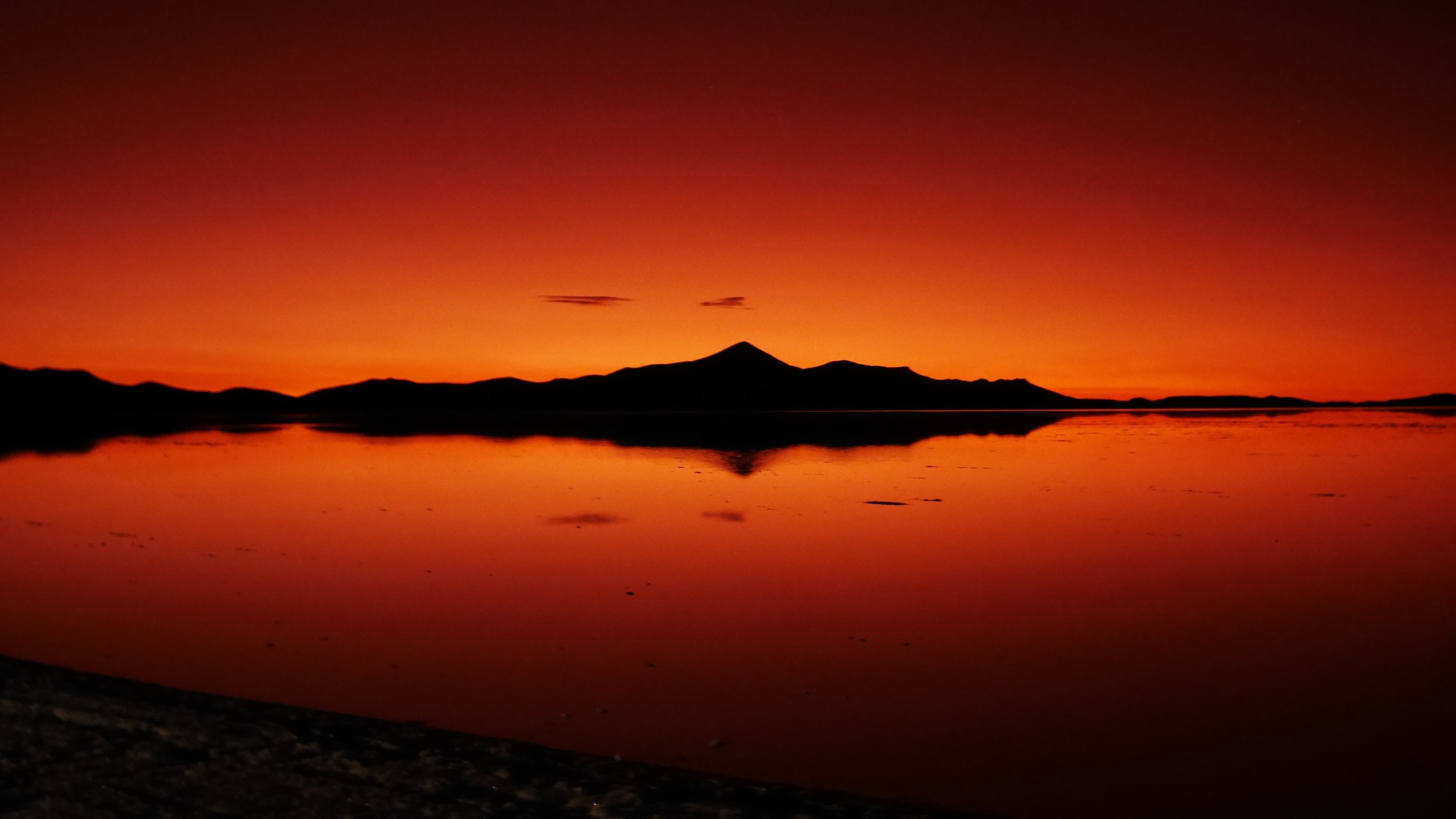 Le jour s’achève avec le coucher de soleil à la Laguna Colorada. Où les montagnes alentours se reflètent dans son eau rouge.