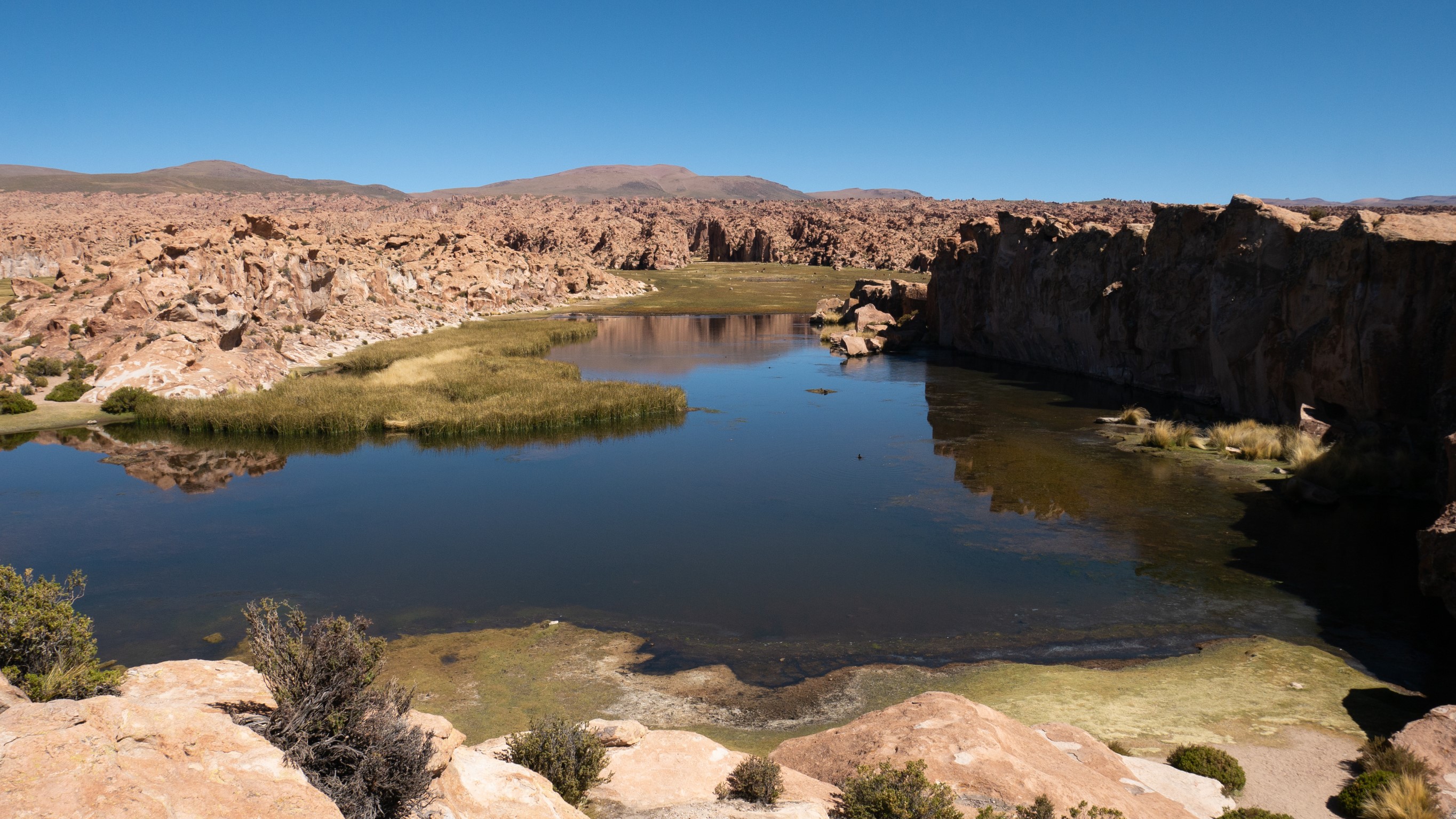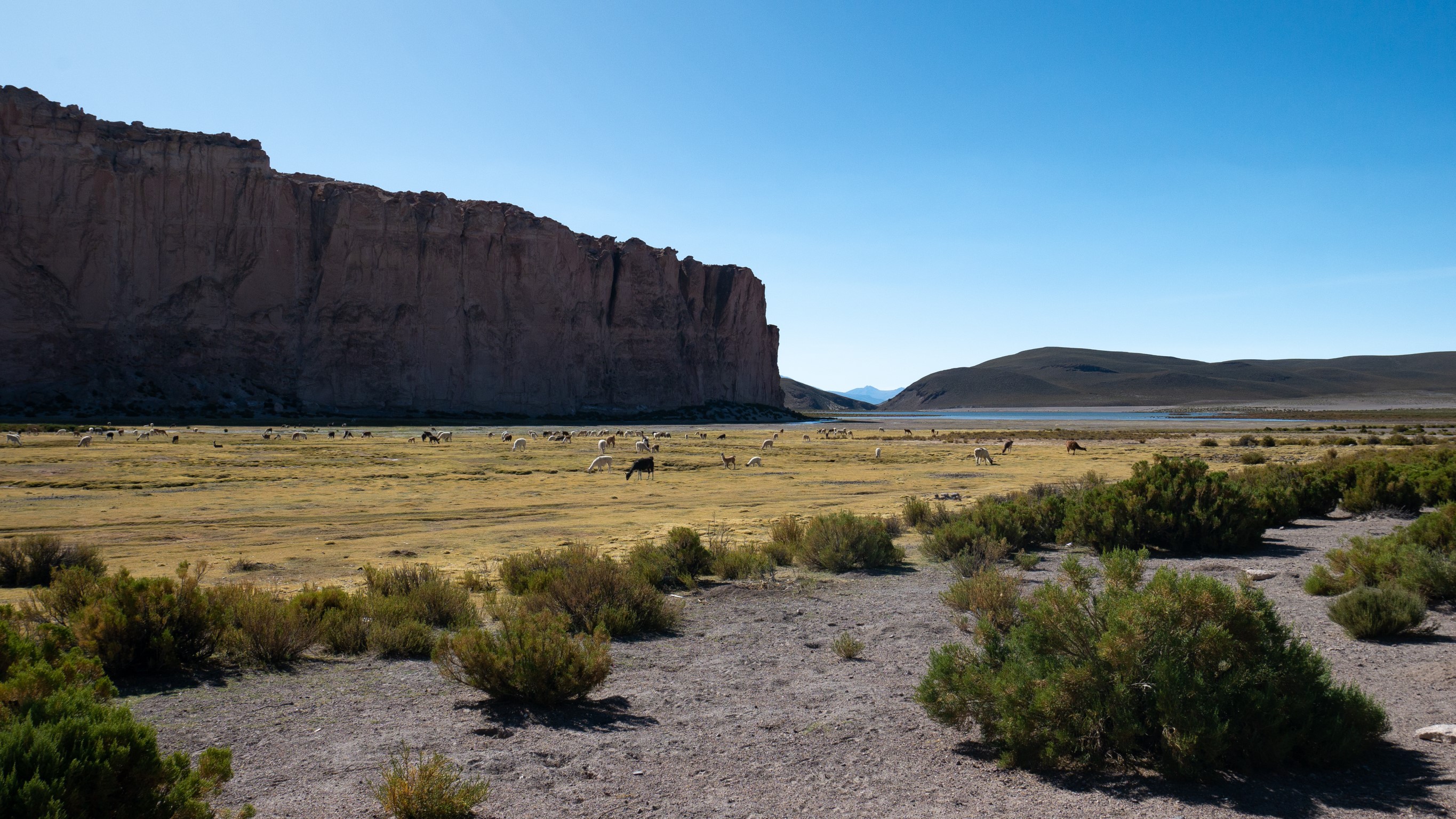 Puis, nous faisons un stop exceptionnel à la Laguna Negra, perdue au milieu des lamas. Ici, un silence naturel s’installe dans le groupe. Comme une pause dans cette excursion de dingue. On observe les canards, les oiseaux se poser sur la laguna, y pêcher des poissons et surtout écouter leurs cris qui résonnent…un moment magique. S’en suit une séance d’observation des lamas. (c’est rigolo de penser au guide qui doit halluciner de voir des touristes s’émerveiller devant les troupeaux de lamas comme si chez nous les touristes s’émerveillaient devant nos vaches)