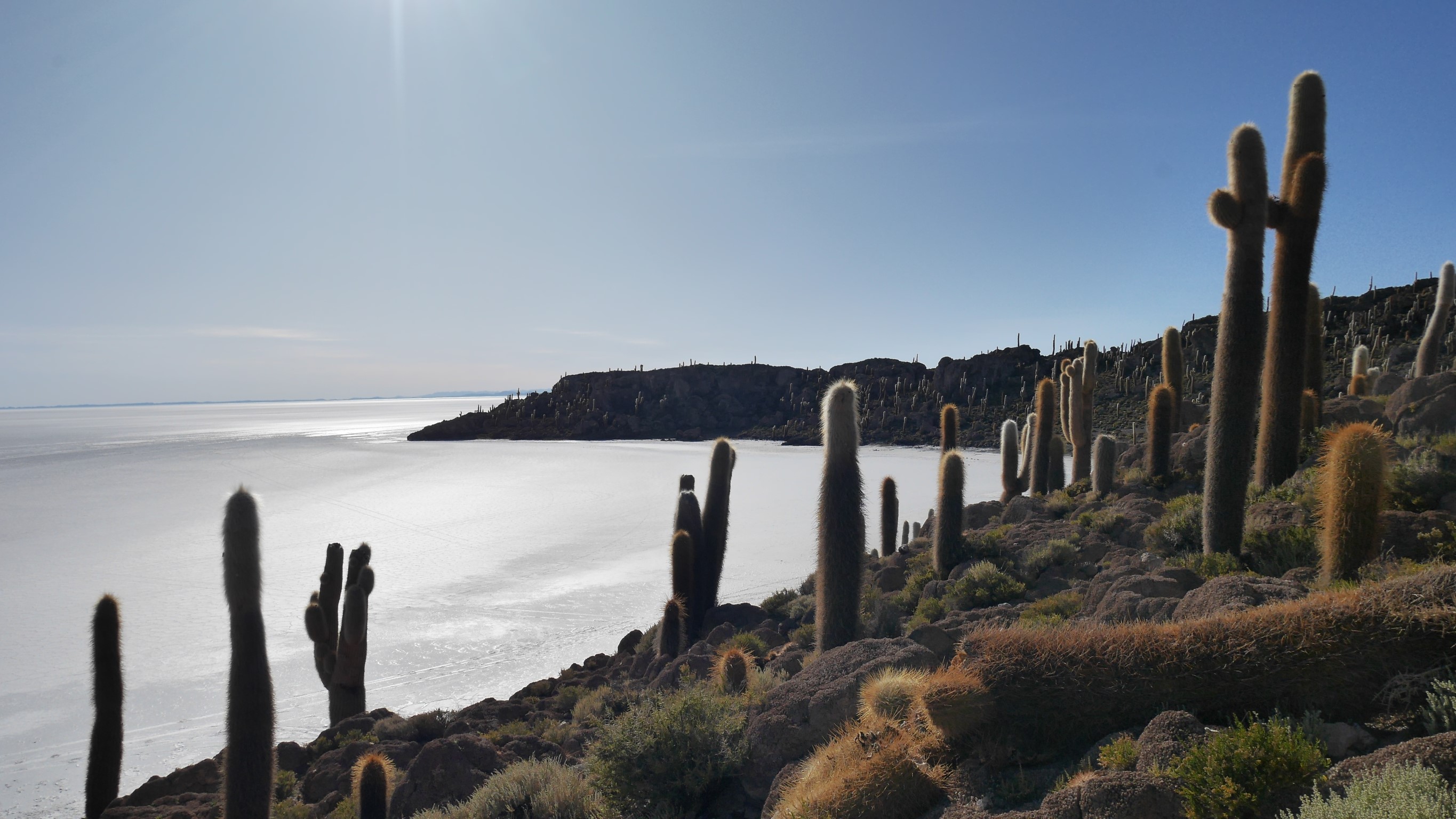 Après une nuit très courte à l’hôtel de sel. (Appelé comme ça car tout est en sel, les murs, le mobilier etc.. léché et approuvé par Damien ^^ ) nous partons cette fois-ci, pour le lever du soleil au Salar. L’effet miroir est bluffant. Puis nous allons visiter l’Isla Incahuasi, une île au milieu du Salar d’où on peut apprécier l’immensité de cette étendue de sel qui semble infinie. Nous prenons même le petit déjeuner ici, dans ce cadre idyllique.