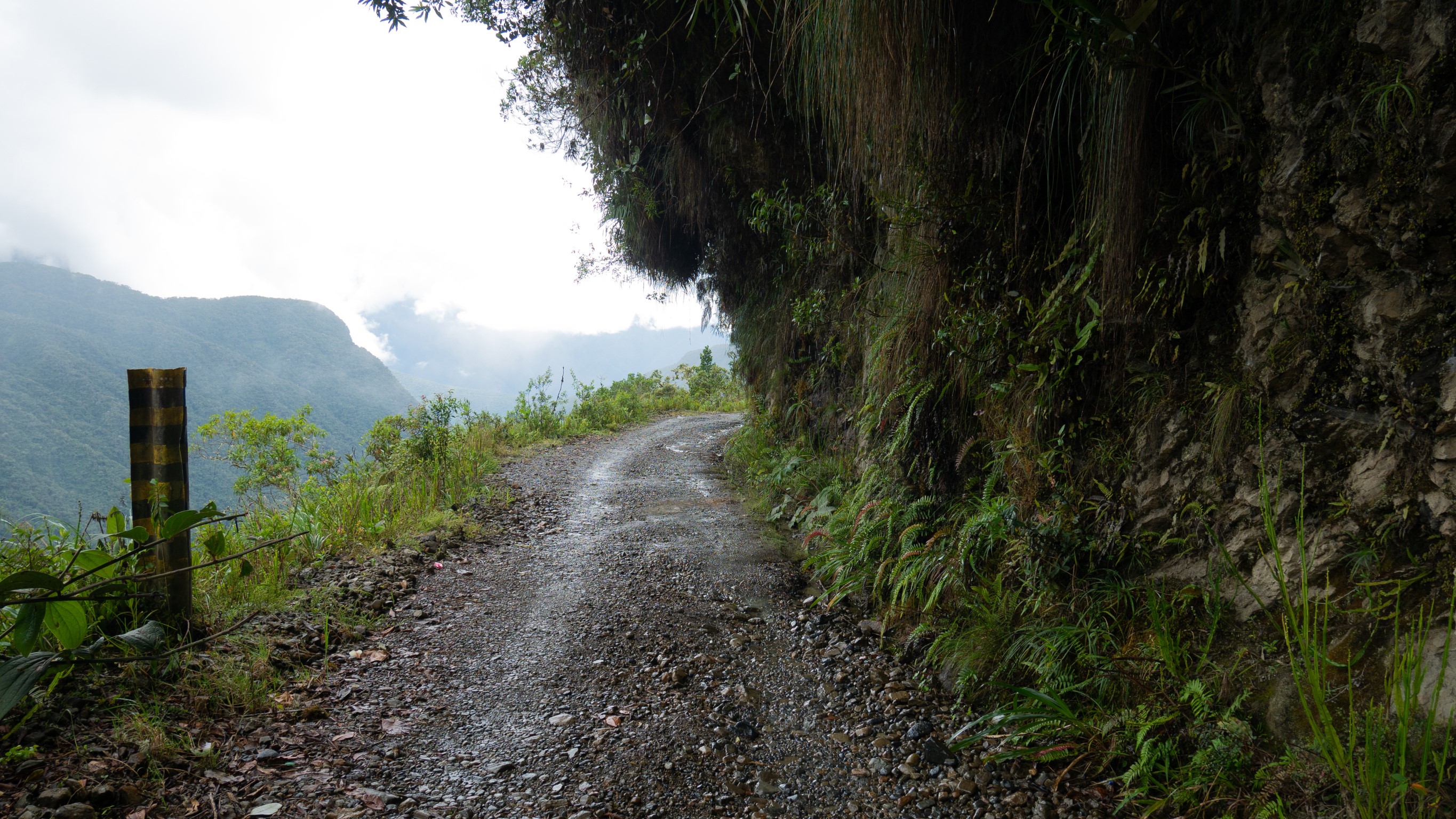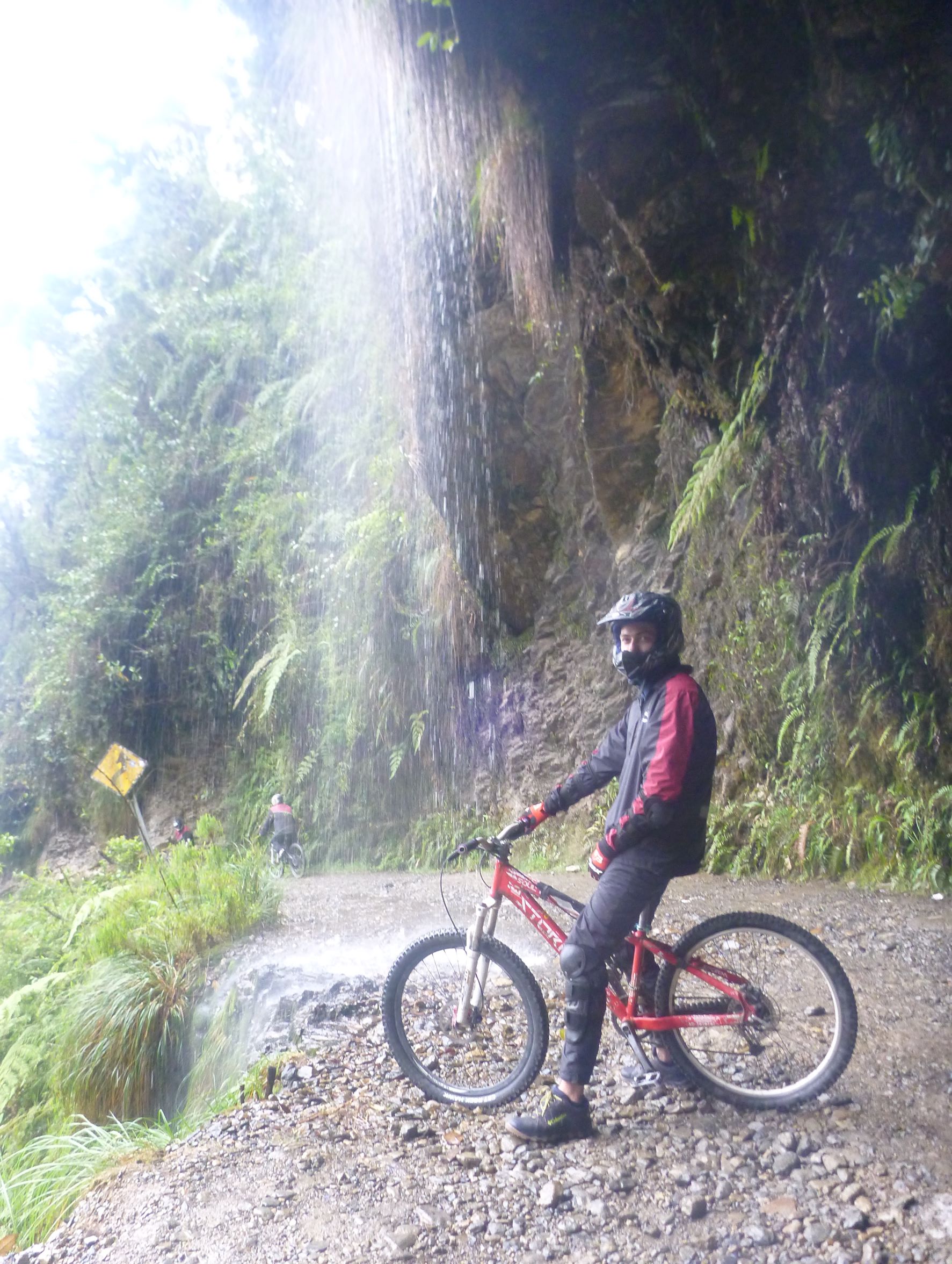 Puis tout le monde remonte dans le van pour 20 min de route et arriver au départ de « la vraie » route de la mort. C’est sous la pluie et dans les nuages qu’ils se mettent à dévaler les premiers kilomètres de route en terre pleine de cailloux et de trous avec ..surprise, le ravin juste là.