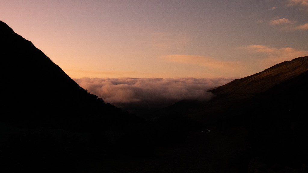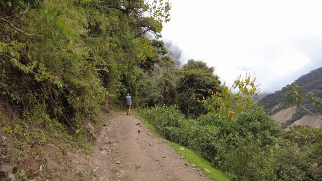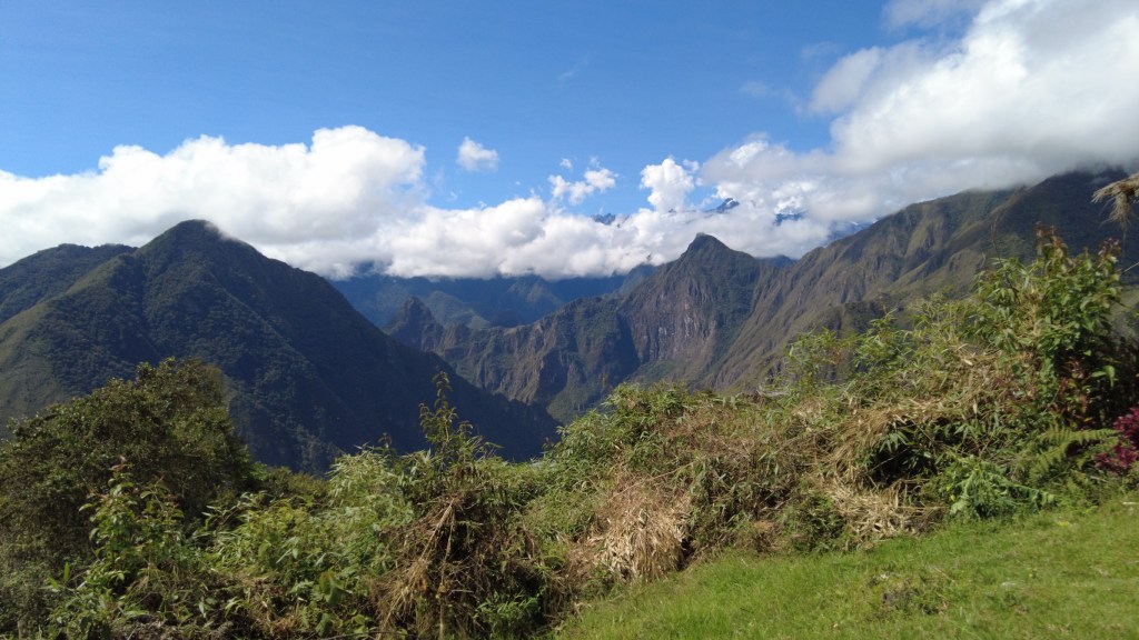 4ème jour : La journée s’annonce longue. Déjà parce que nous devons rattraper ce que nous n’avons pas fait la veille, ce qui élève la journée à un total de 21 km mais surtout parce que Damien n’est vraiment pas en forme et ne peut rien manger. C’est dans ces mauvaises conditions que nous commençons par une montée de plusieurs heures sur 745 m de dénivelé, complètement dans les nuages alors que la vue devait être exceptionnelle et avec la journée de la veille, nous aurions bien eu besoin qu’elle se découvre. La Pachamama a dû entendre notre désarroi puisque d’un seul coup, en une seconde, les nuages se mettent à s’élever pour dégager complètement la vue sur la vallée…