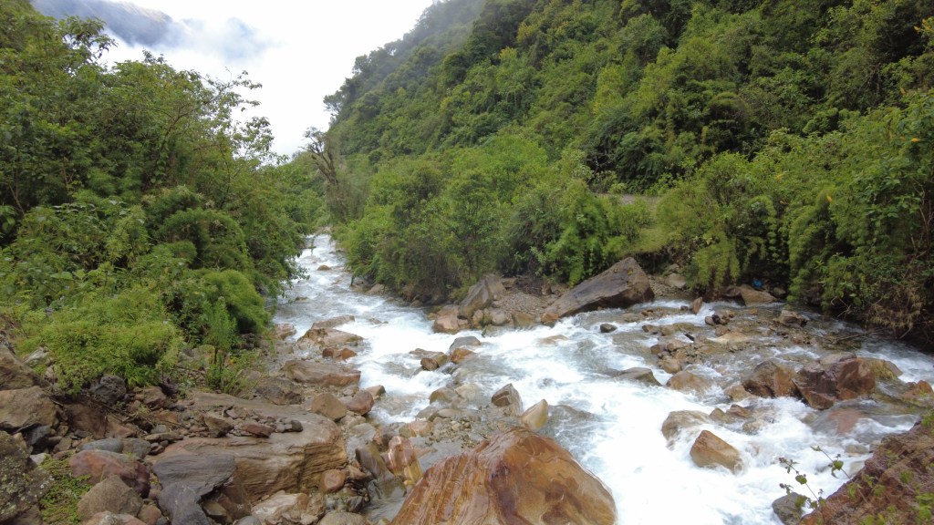 3ème jour : Le décor change chaque jour pour notre plus grand bonheur. Alors que les groupes avec guide partent par la route, nous nous choisissons de suivre le vrai sentier du Salkantay de l’autre côté de la rivière et quel bonheur. Nous croisons 2 autres personnes seulement sur les 17 kilomètres que nous marchons. Ici, la forêt tropicale nous entoure. Le bruissement des feuilles, l’odeur de la terre mouillée par la pluie de la nuit, les gouttes sur les feuilles qui terminent leur course sur nos têtes, les cascades et les clapotis de la rivière nous émerveillent à chaque pas. La journée s’écourtera malheureusement à Lucmabamba à cause d’un jus de fruit pas si frais, prit sur le trajet..