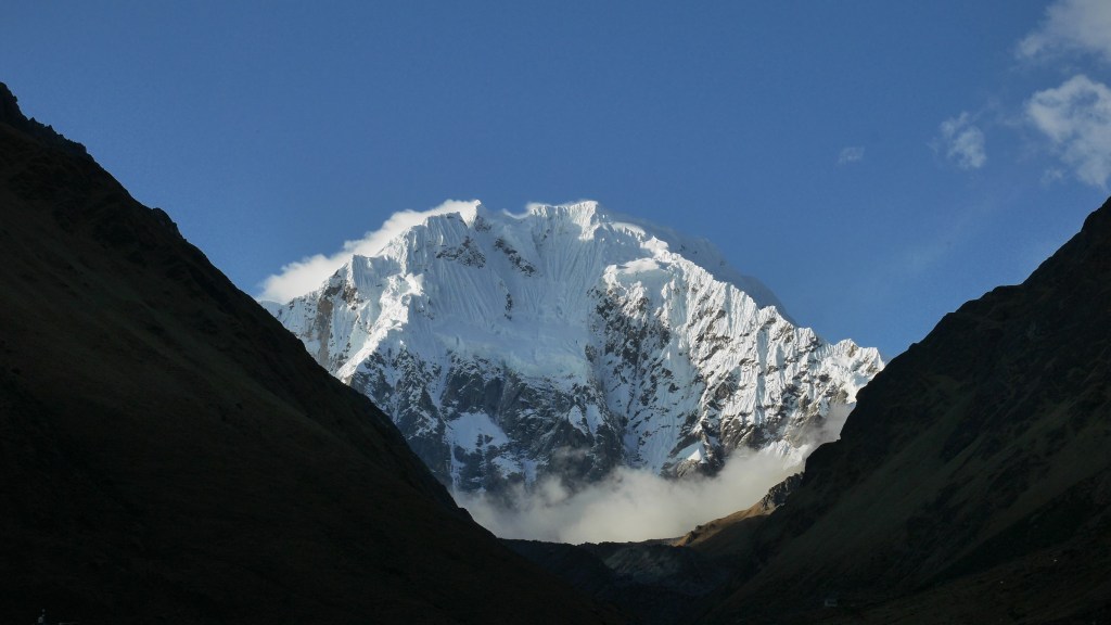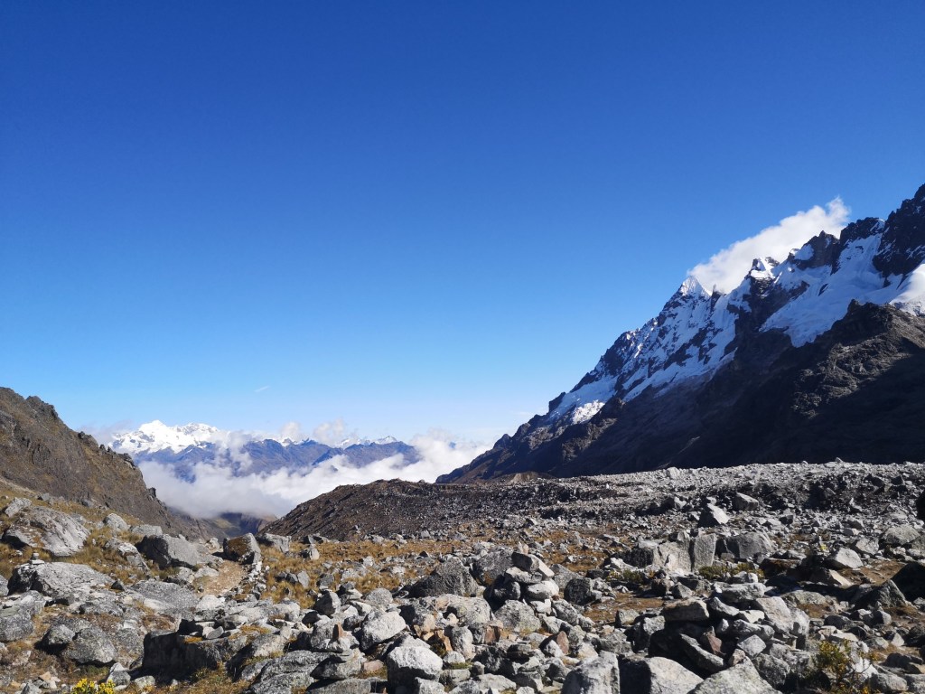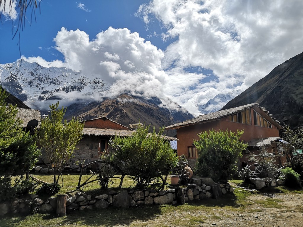2ème jour : Aujourd’hui c’est une grosse journée, nous partons à la frontale à 5h30 pour essayer d’éviter les groupes partis avec une agence. Là ça ne rigole plus, 21 km nous attendent mais surtout le passage par le col du Salktantay nous oblige à grimper 800m de dénivelé pour arriver à 4600m d’altitude (notre record à pied youhou !) Là, une vue incroyable s’offre à nous, des montagnes, des glaciers, de la neige éternelle, au loin les nuages sur notre destination que nous dominons laissent apparaître des pics enneigés. Par contre s’en suit une longue descente sur 1760m de D- jusqu’à Chaullay où nous y avons laissé nos genoux.