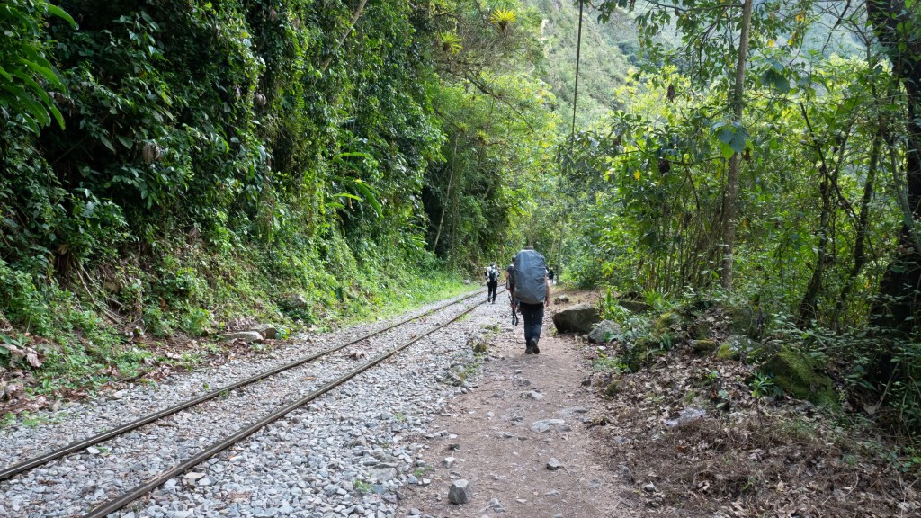 Tout s’aligne enfin. Damien va mieux, le soleil brille, le Machu est face à nous de l’autre côté de la vallée. Nous voilà remontés à bloque pour redescendre les 1042 m de dénivelé négatif qui nous séparent d’Hidroelectrica. D’ici, il nous reste encore 10km à marcher le long des rails du train. On ne vous cache pas que cette partie était quasi la plus difficile en tout cas mentalement. Le chemin est noir de monde puisque les touristes qui viennent au Machu et qui ne payent pas 50 dollars de train font ce trajet à pied. De plus il n’y a aucun attrait et les 4 jours commencent à se ressentirent sur le dos et dans les jambes.