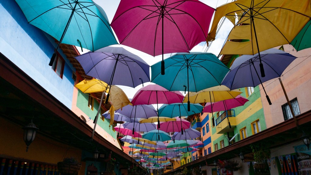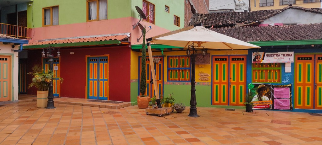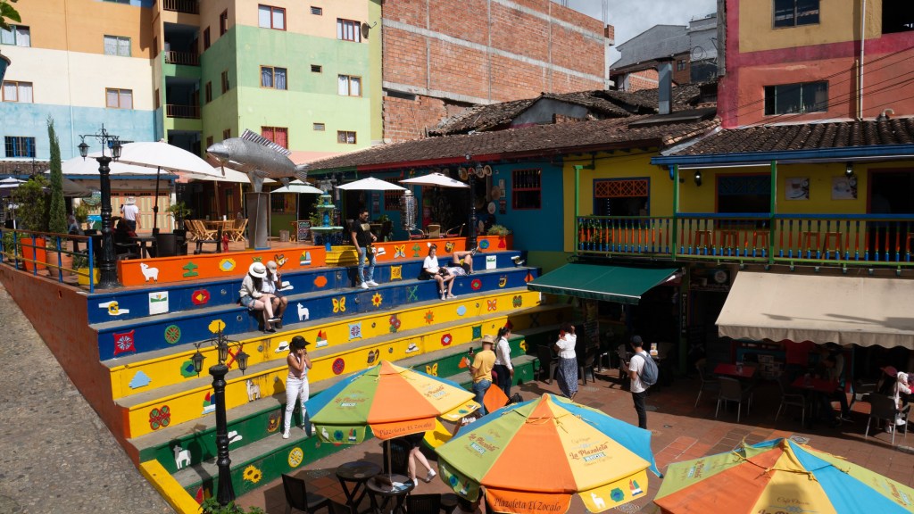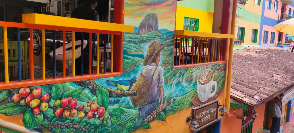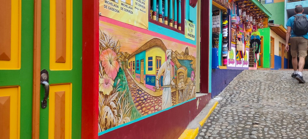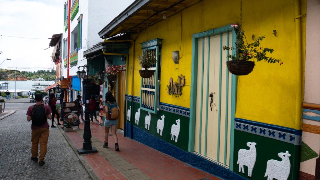 Plus bas, le petit village de Guatapé arbore des maisons toutes plus colorées les unes que les autres. Leurs spécificités sont les plinthes traditionnelles représentant des choses que les habitants des maisons aiment ou par lesquelles ils se définissent.