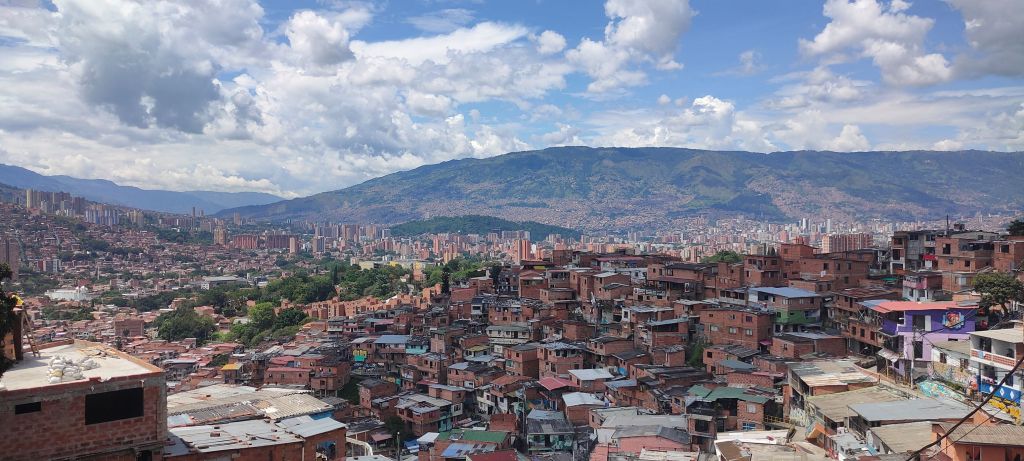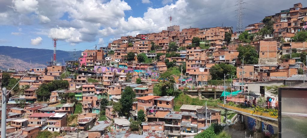 On remarque tout au sommet de la montagne des maisons en bois. Celles-ci sont des maisons illégales que se construisent les gens des campagnes qui ont tout perdu lorsque les narcos ont réquisitionnés leurs terres pour faire pousser de la coca et que le gouvernement n’a pas pu reloger tant il y a de demandes.