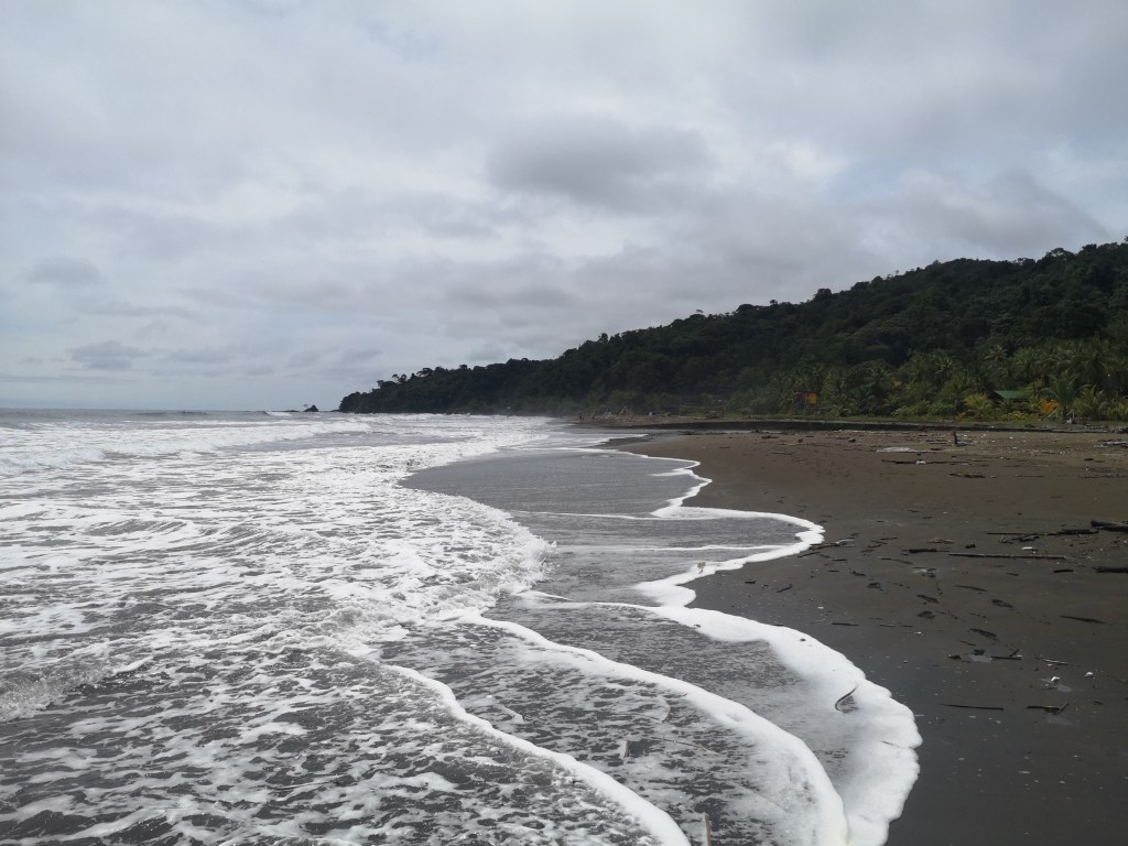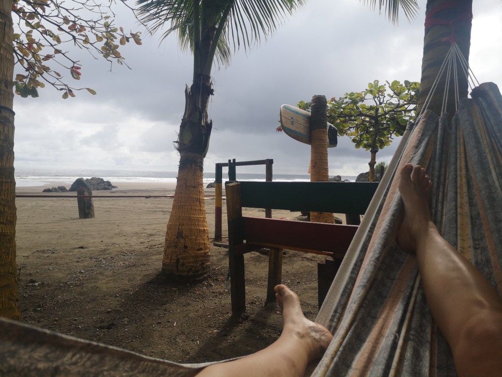 L’hostel étant sur la plage nous prenons le petit déjeuner en regardant les marées monter et descendre, admirons les surfeurs s’aventurer dans les vagues, nous balançons dans les hamacs en scrutant l’horizon à la recherche d’une baleine qui déciderait de faire des acrobaties. Vivant en maillot, on est tout le temps mouillés soit par les baignades régulières dans l’eau à 30° soit par la pluie ou bien l’humidité ambiante. Soudain, le temps se gâte et on regarde tomber la pluie quelques heures.