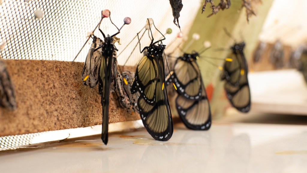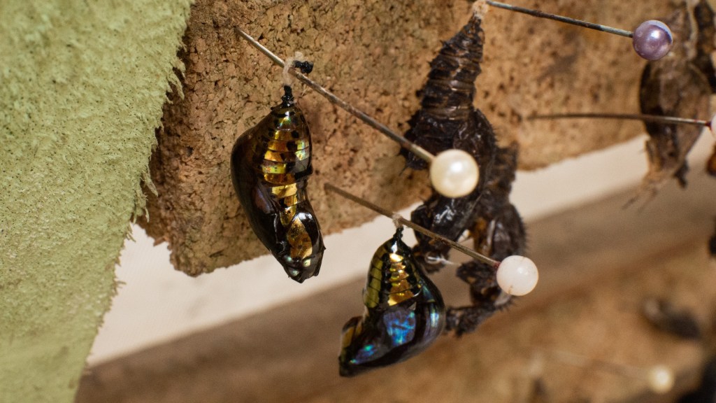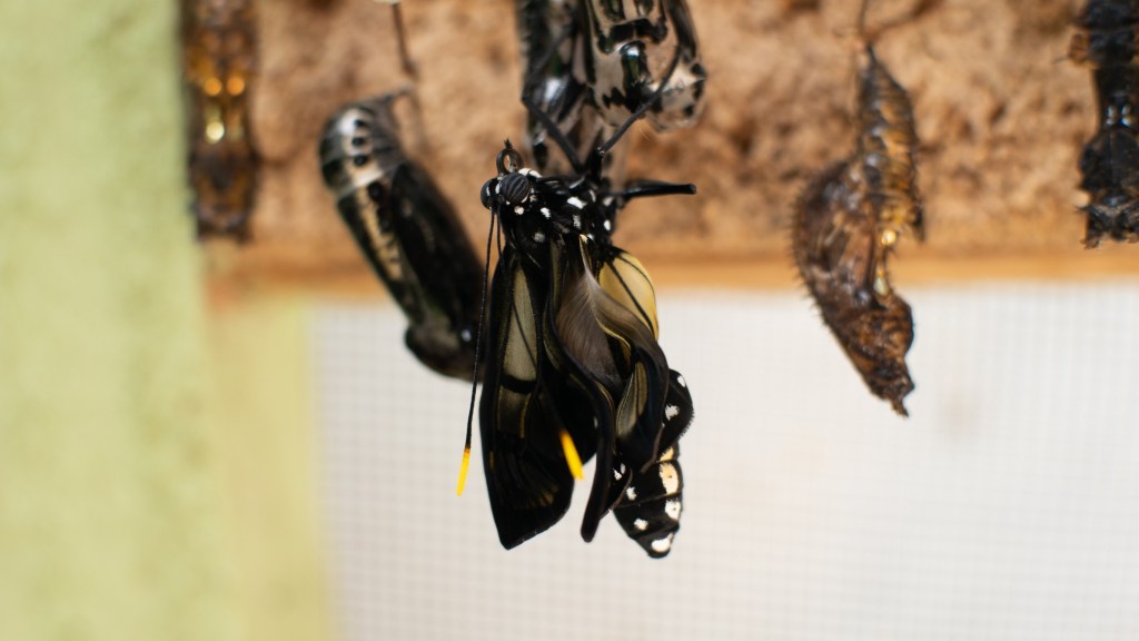 Nous sommes restés au moins 1h à regarder le tableau sur lequel ils accrochent les cocons prêts à éclore. C’est fascinant de les voir s’extirper tant bien que mal de leur chrysalide avec leurs ailes toutes molles et toutes pliées et prendre leur envole au bout de quelques heures.