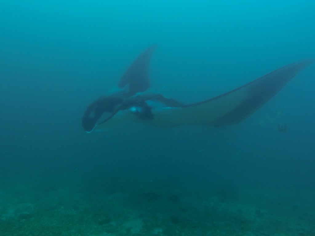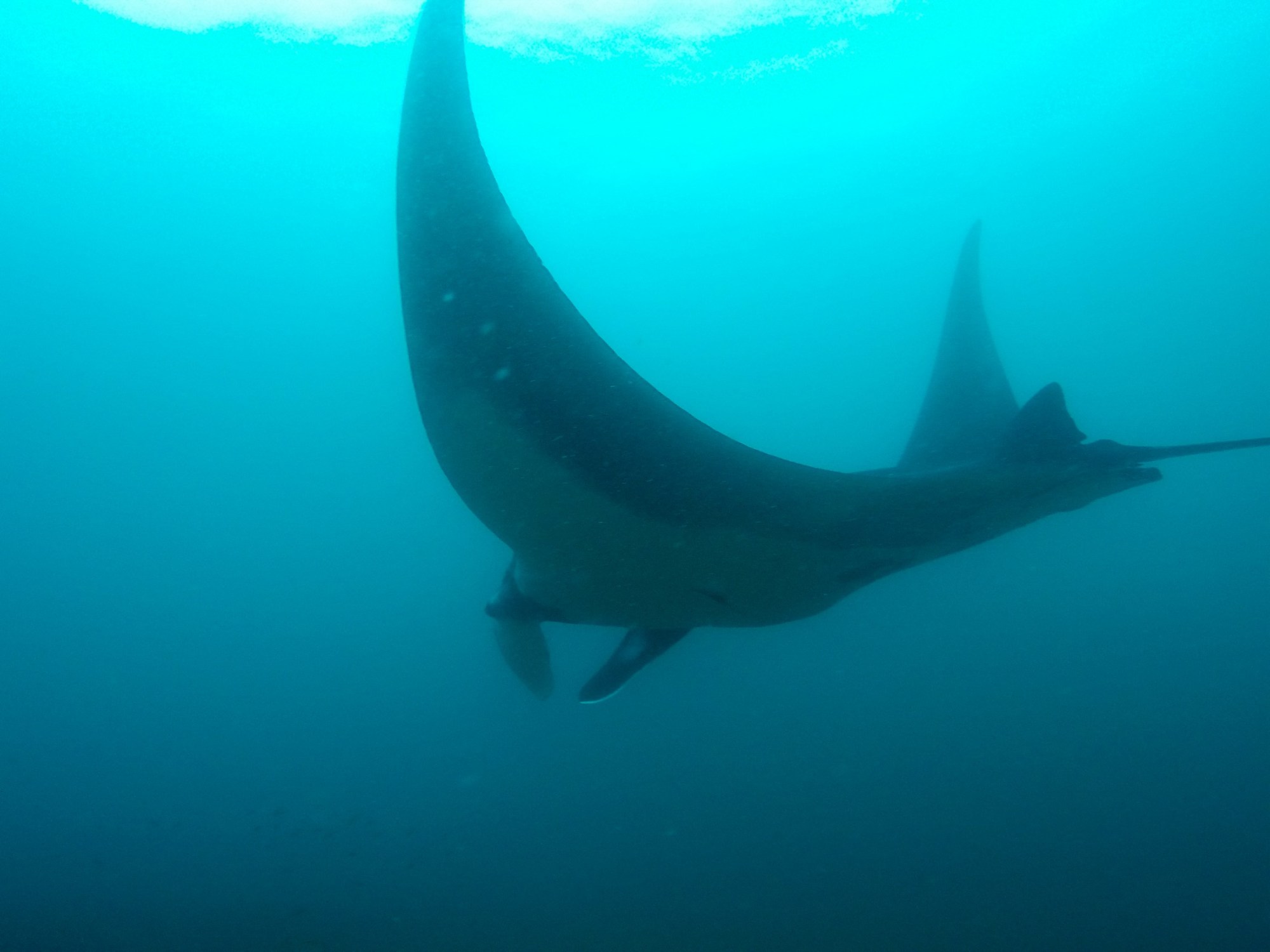 En train de chausser nos masques sur le bateau, nous apercevons une raie manta tout près!