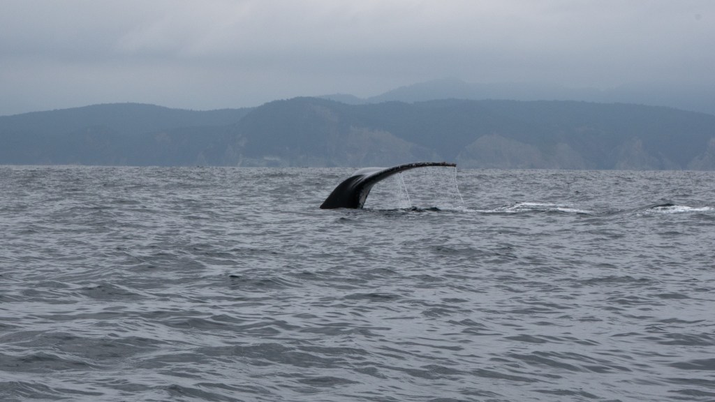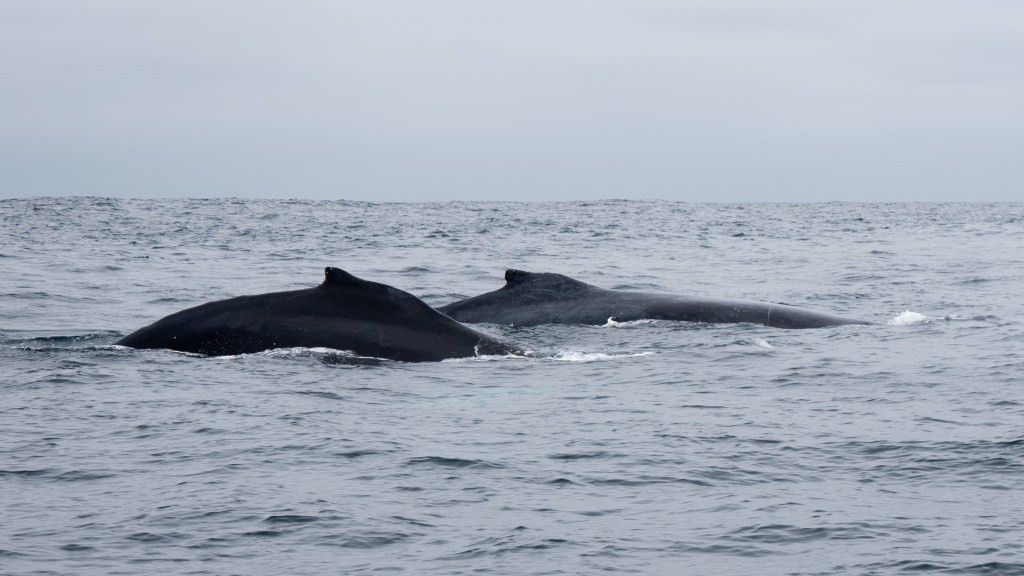 Nous commençons la journée par voir le spectacle des baleines qui sautent de partout, tapent leurs nageoires dans un claquement fort, on a même un petit baleineau qui vient nous faire une pirouette juste à côté du bateau.
