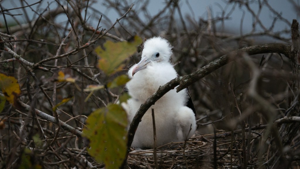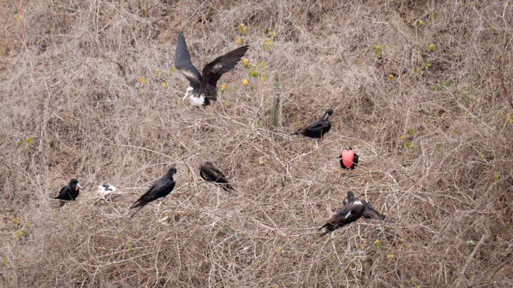 Nous pouvons aussi voir de nombreuses frégates. La période de reproduction étant, pour eux, terminée nous n’aurons la chance de voir que de très loin un seul oiseau avec son sac gulaire rouge gonflé sur le cou. Par contre nous pouvons voir les petits bébés frégates tout minions et tout duveteux dans leurs nids.