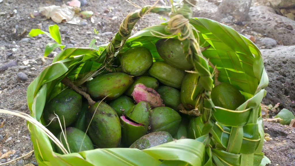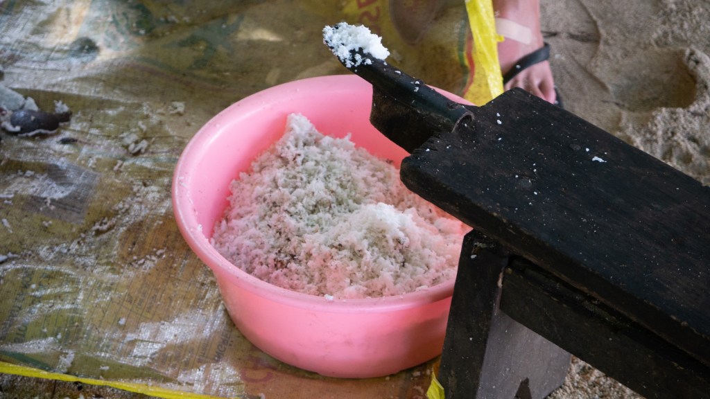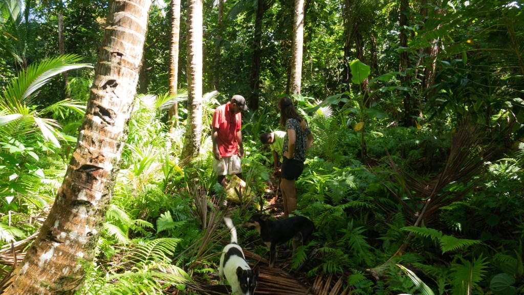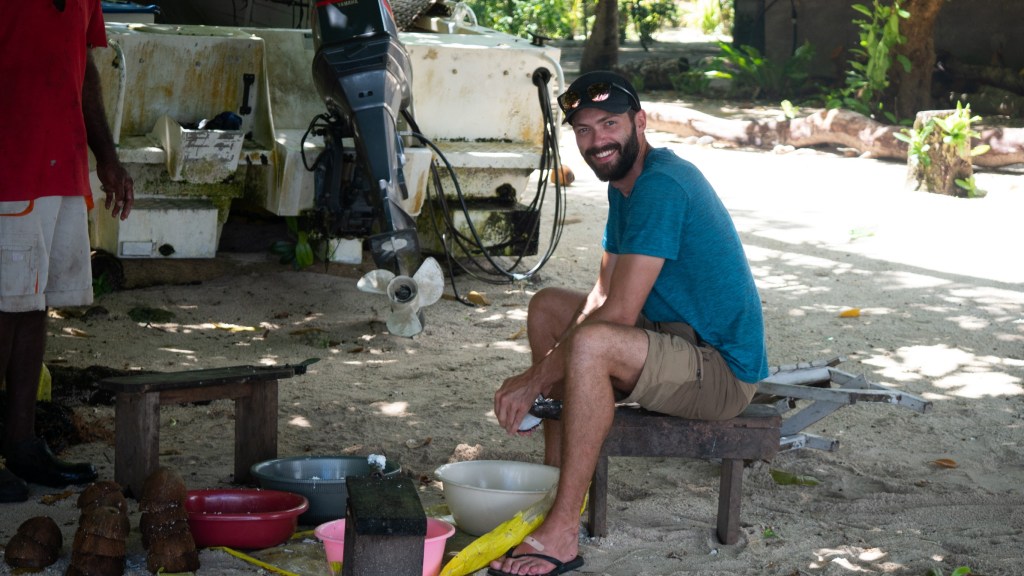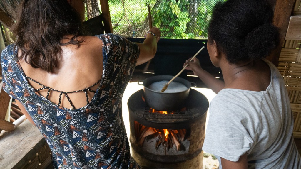 Aujourd’hui, c’est activité fabrication d’huile de coco, nous allons les ramasser dans la forêt, les râpons sur un petit banc, les essorons, filtrons la pulpe puis mettons à cuir le jus tout en essayant de maintenir notre feu de bois suffisamment fort. On touille, 1h…..2h…..3h….puis Sharon nous dit d’aller manger et qu’elle va continuer de remuer jusqu’à ce que ça devienne rouge au fond.