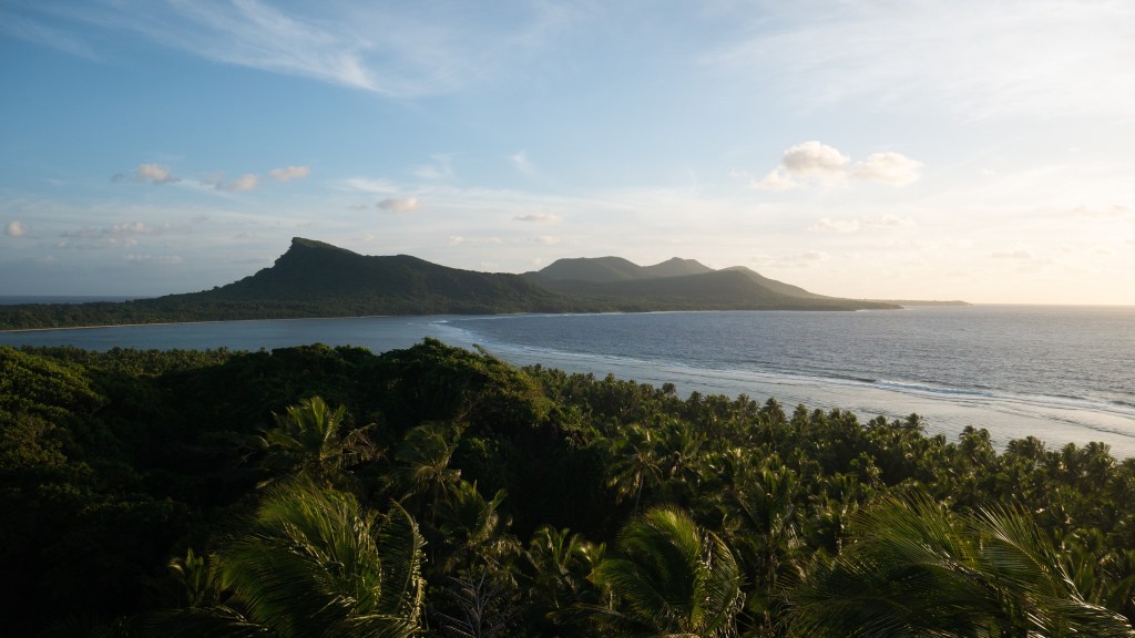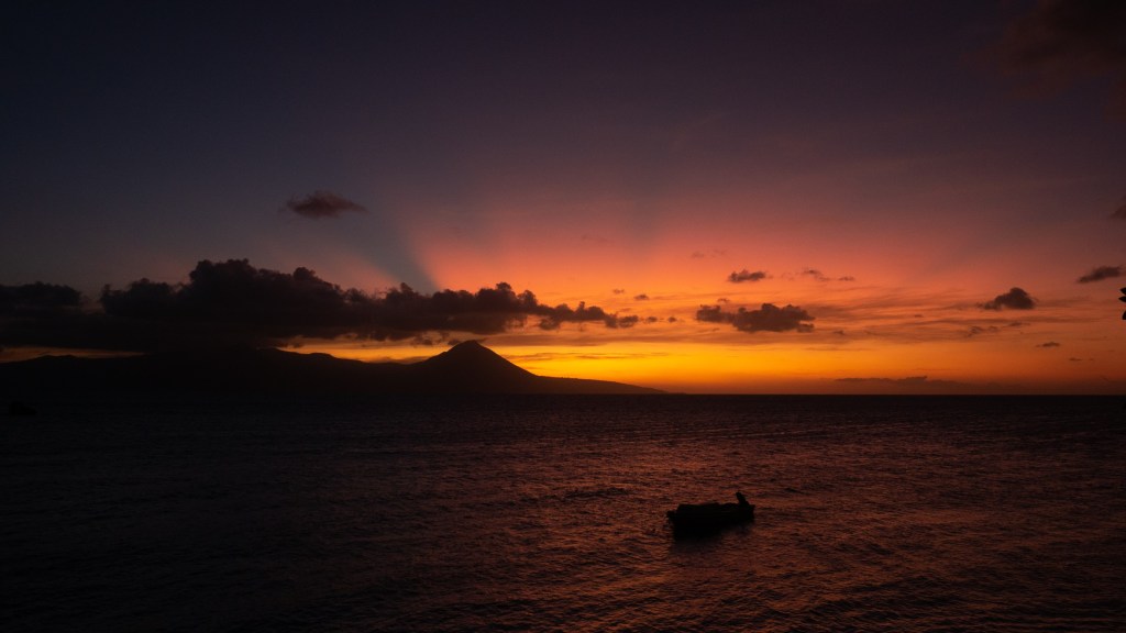 Le lever de soleil est magnifique, du haut du rocher, nous dominons l’île et la couleur dorée fait ressortir le vert fluo des palmiers. L’instant est doux, la nature est vraiment superbe, ça adoucit un peu notre moral éprouvé. Nous savons aussi que nous partons aujourd’hui ça aide un peu, enfin nous espérons que l’avion va passer sinon nous sommes repartis pour une semaine et là, ça va être compliqué pour notre santé mentale.