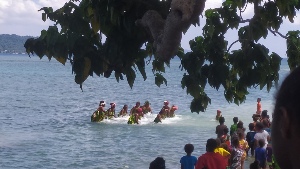 Une dizaine de femmes sont dans l’eau avec leurs belles tenues de feuilles et de fleurs et commencent à chanter une mélodie magnifique accompagnée de leurs percussions aquatiques…