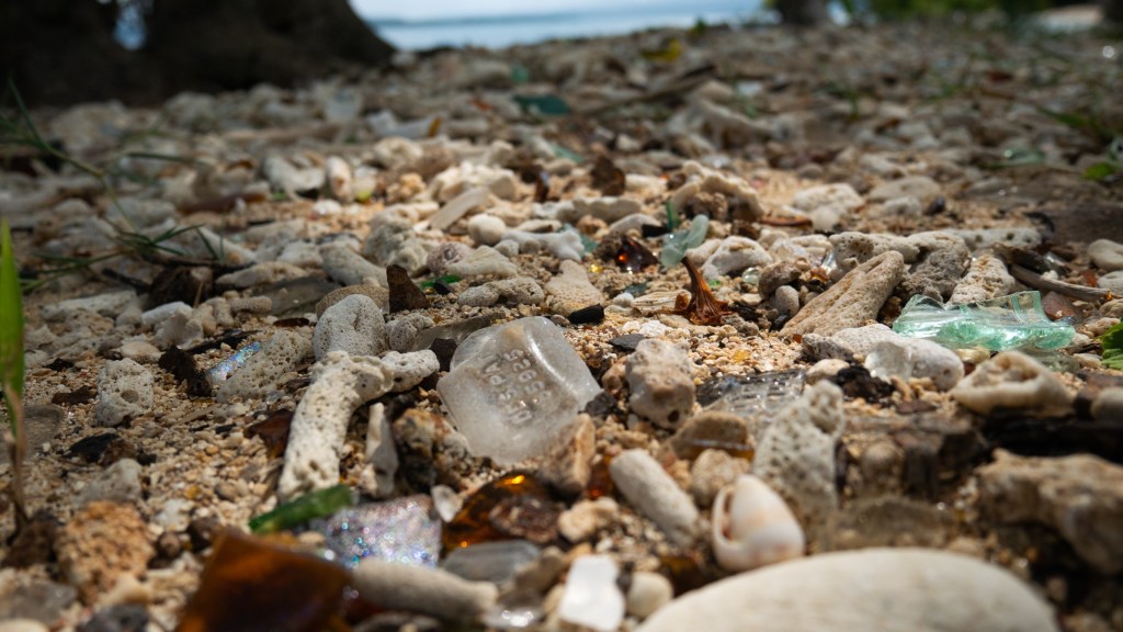 Il nous montre son petit musée, comme il l’appelle, où se trouve des bouteilles de coca, de perrier, d’orangina datant de 1939 à 1947, des bouts de vaisselles avec le symbole de l’US Army ou de la marine. Les Américains avaient donc créé leur base avancée du pacifique ici mais elle n’était pas très bien positionnée, les soldats n’avaient pas grand-chose à faire ici à part réparer un peu le matériel.