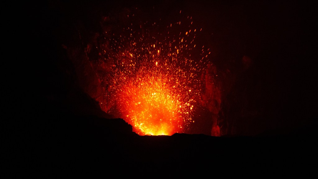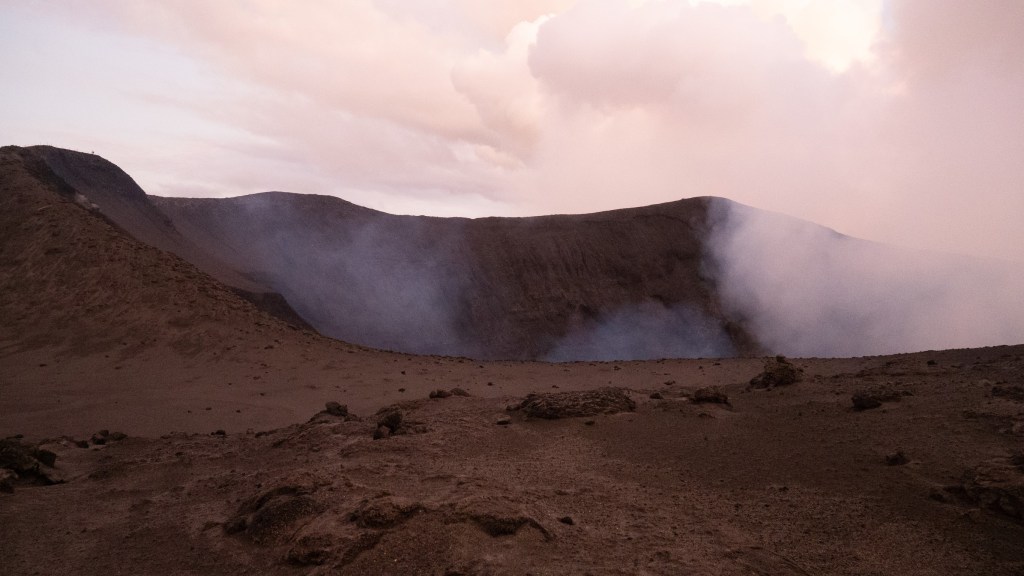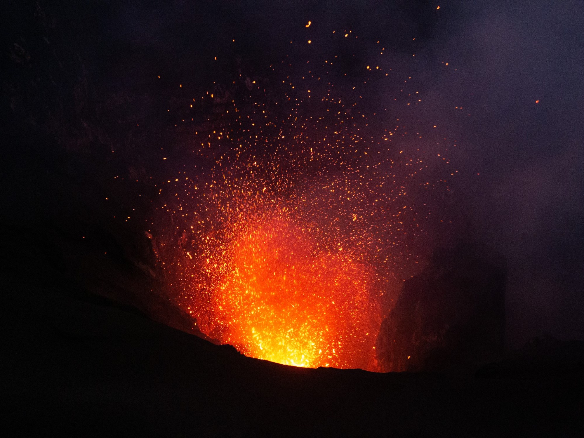 Arrivés au sommet du cratère, une énorme explosion se fait entendre, on voit une lumière rouge s’intensifier dans le cratère, tout notre corps tremble sous le grondement, les poils se dressent, les larmes perlent aux bords des yeux, on s’approche encore…ça y est le cratère est là !