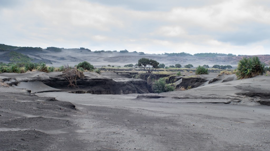 Nous passons par la plaine de cendres où il y a 20 ans, un lac énorme recouvrait tout, puis suite à une forte pluie il a débordé et depuis seule une petite rivière s’écoule au milieu de ce désert.