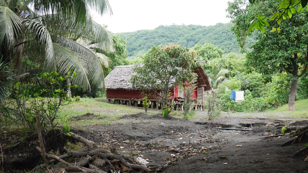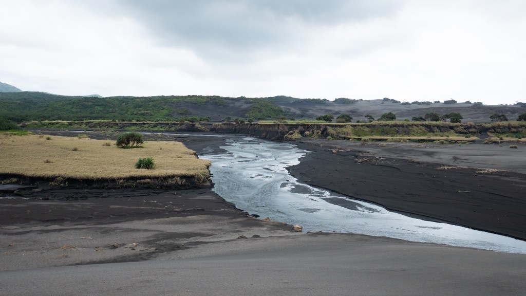 On rencontre différents villages sur notre route avant d’arriver sur la côte où une rivière brûlante s’écoule dans la mer. On ne s’est pas fait prier longtemps pour barboter face au volcan dans une eau à 40°C.