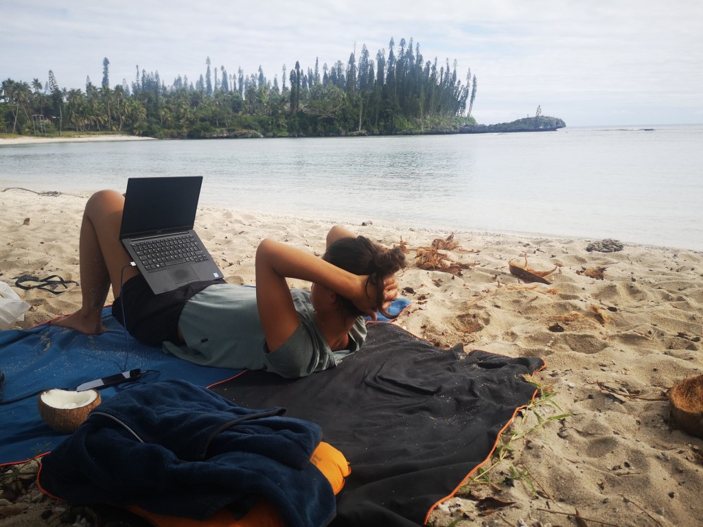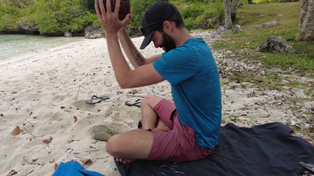 Ayant fini de visiter tout ce qu’on voulait voir, nous retournons passer l’après midi à la plage aux tortues où on les voit sortir constamment leur petite tête de l’eau. Pour accompagner ce beau spectacle, nous nous ouvrons, comme souvent maintenant, une coco pour le goûter (au couteau suisse 😂) et un groupe d’au moins 20 dauphins passent juste au bout de la plage en sautant dans les vagues, une bien belle scène de fin pour cette deuxième île Loyauté.