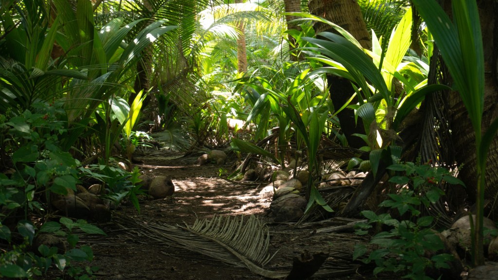 Un pick up nous emmène à travers une cocoteraie puis nous dépose au début de la rando, après nous avoir fait manger la moitié des branches dans la figure…