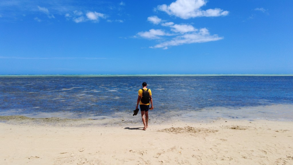 C’est vrai que la plage est belle et le lagon superbe mais nous sommes quand même un peu déçus devant les dizaines de mètres d’algues qui séparent le sable de l’eau bleu turquoise.