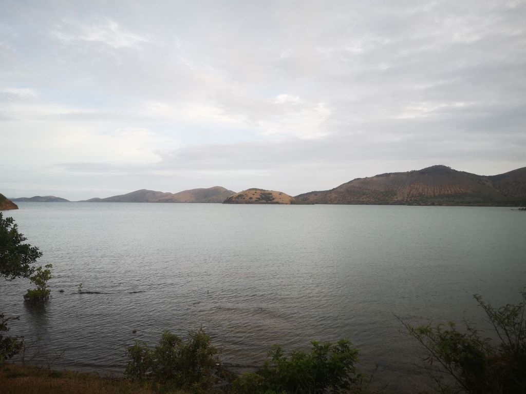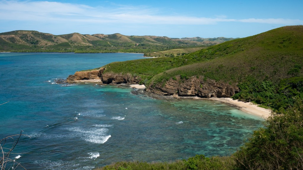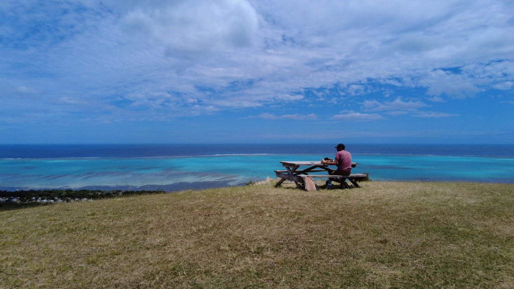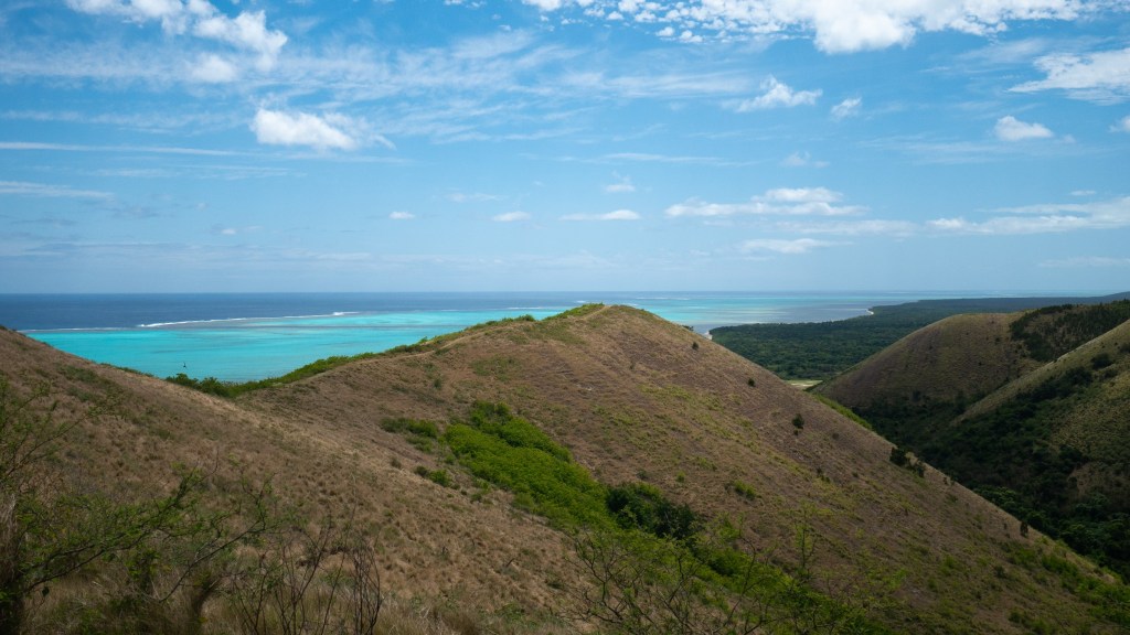 Les collines font face au lagon d’un bleu incroyable, coupé par un lit bleu foncé correspondant à la fameuse faille.