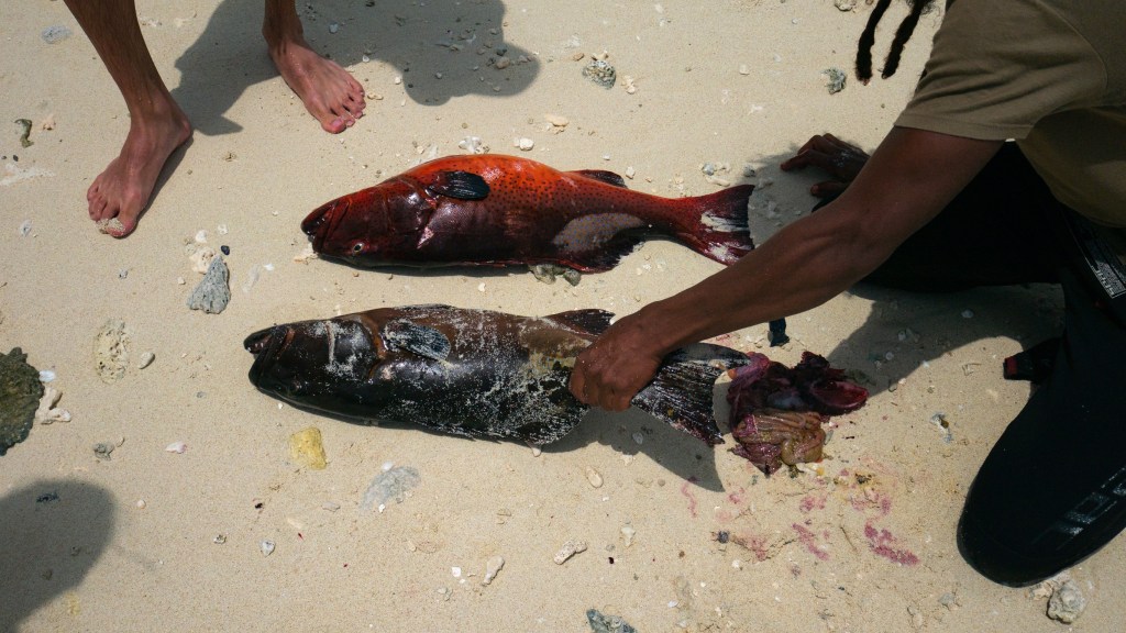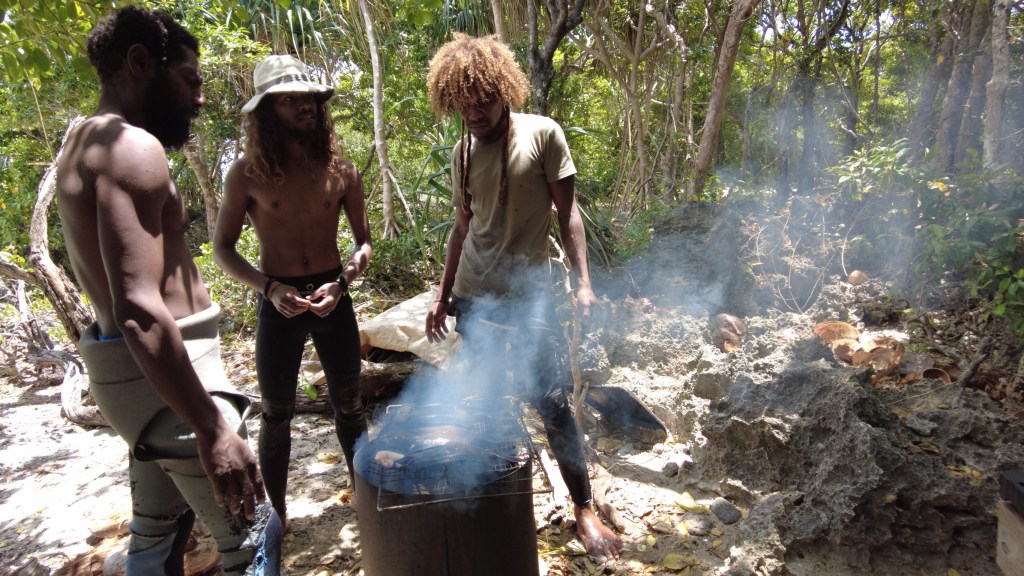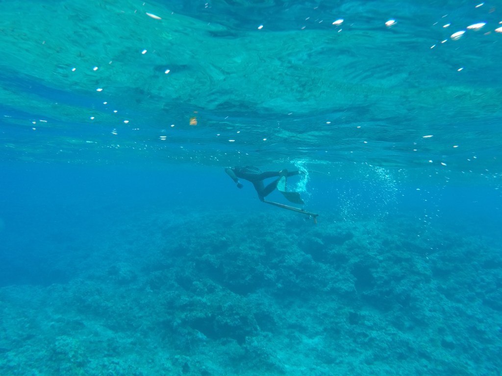 Au premier arrêt, notre capitaine nous annonce que les garçons qui l’accompagnent vont aller pêcher au harpon et qu’on peut aller dans l’eau pour les regarder faire.