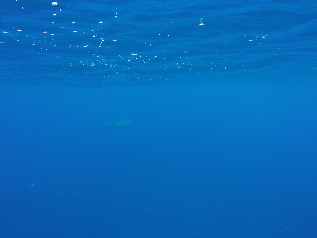 Damien est le premier à se jeter à l’eau et il me dit , « oh y a un requin juste sous le bateau, viens vite!«