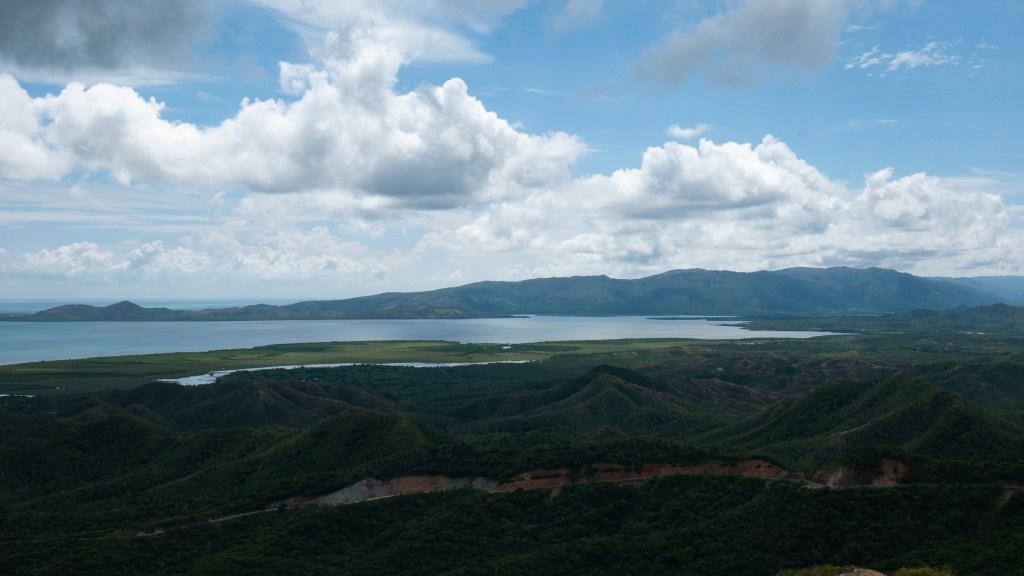 En revanche l’ensemble de la vue est superbe puisque le lagon, la grande barrière de corail, les marais salants et les reliefs des montagnes se partagent le panorama.