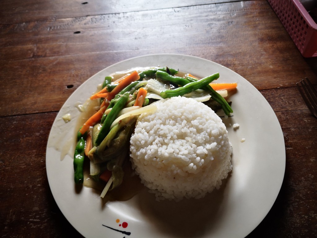 Au petit déjeuner, Lohren et son mari prennent le temps de papoter avec nous, de nous raconter le covid mais aussi la vie dans le village. Les enfants qui partent étudier à la ville et la possibilité de revenir travailler dans les rizières s’ils ne finissent pas l’école. Avec la quantité énorme de terrasses, nous demandons combien de kilos de riz ils vendent, ce à quoi Lohren rigole et nous dit que ce n’est que pour leur consommation et qu’ils sont même obligés d’acheter du riz l’été parce qu’ils n’en ont plus assez.
